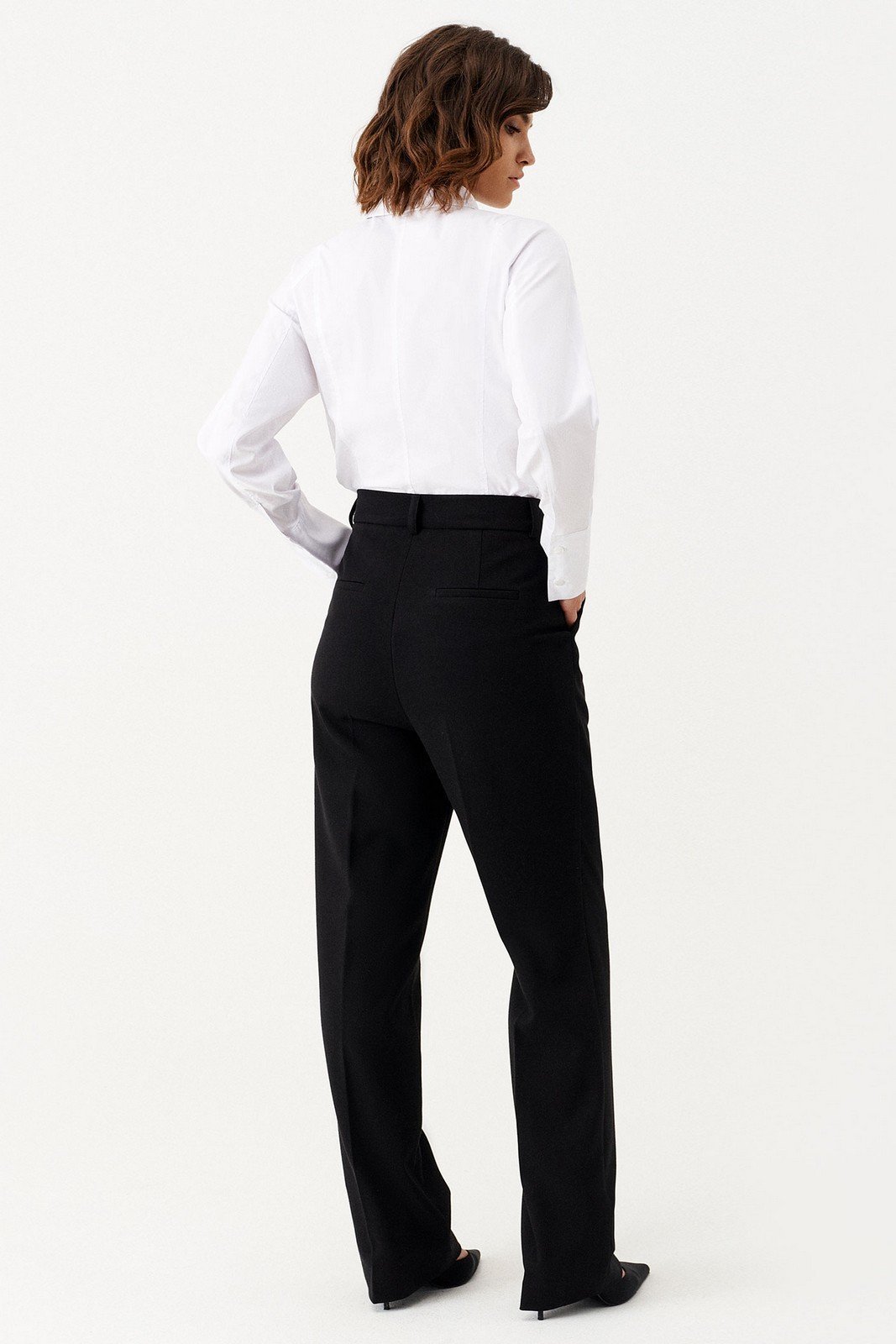 Брюки женские из поливискозной ткани для повседневной носки. Брюки прямые, слегка зауженные. На передней части брюк есть боковые карманы.Верх брюк обработан отрезным поясом, застёгивающийся на тесьму-молнию и потайной крючок. На задней части брюк есть талиевые вытаки и прорезные карманы. Ткань однотонная.