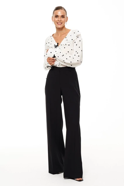 Эти женские классические брюки выполнены из смесовой ткани, что делает их идеальным выбором для повседневной носки. Верхний срез брюк обработан притачным поясом, дополненным застежкой на крючок и молнию. Наличие шлёвок позволяет носить брюки с ремнем, добавляя разнообразие в ваши образы. Задняя часть брюк имеет две талиевые вытачки, обеспечивающие комфортную посадку, а карманы с обтачками и застежкой на пуговицу придают модели функциональность. Эти брюки гармонично дополнят любой наряд, сочетая в себе элегантность и удобство, что делает их универсальным вариантом для различных случаев.