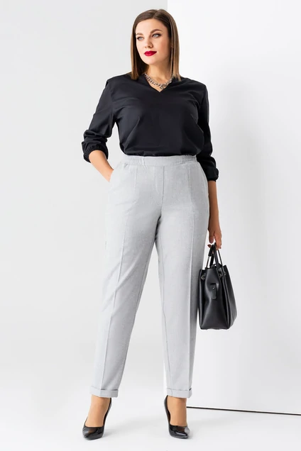 Стильные брюки из мягкой костюмной ткани. Брюки на талии на поясе. Пояс на резинке, что позволяет садиться изделию на разный тип фигуры. По бокам имеются карманы. Брюки чуть зауженные к низу, низ на отложной манжете. Отличный вариант брюк как в офис, так и для повседневных дней.