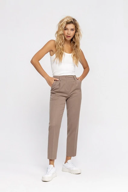 Классические укороченные брюки из текстильной ткани. Детали: брюки со средней посадкой, притачной пояс со шлевками, передние половины с небольшими мягкими складками и заутюженными стрелками, застежка на молнию и пуговицу, боковые карманы.