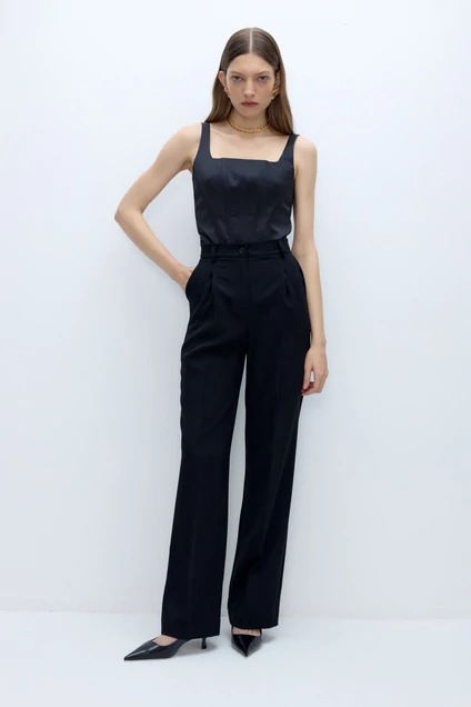 Текстильные брюки-палаццо с высокой посадкой. Детали: высокая посадка, широкие и длинные брюки, притачной пояс со шлевками, передние половины с небольшими застроченными мягкими складками и заутюженными стрелками, застежка на молнию и пуговицу, боковые карманы