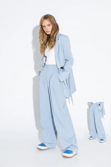 Текстильные брюки-палаццо с высокой посадкой. Детали: высокая посадка, широкие и длинные брюки, притачной пояс со шлевками, передние половины с небольшими застроченными мягкими складками и заутюженными стрелками, застежка на молнию и пуговицу, боковые карманы