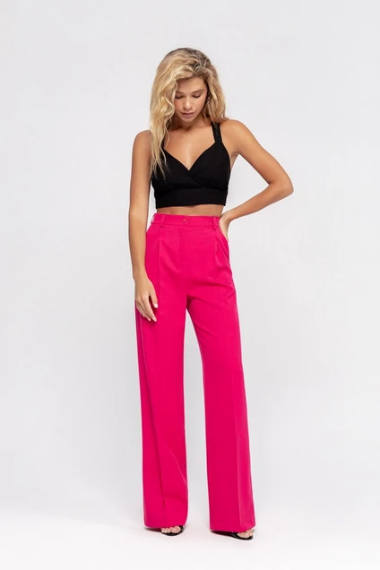 Текстильные брюки-палаццо с высокой посадкой. Детали: высокая посадка, широкие и длинные брюки, притачной пояс со шлевками, передние половины с небольшими застроченными мягкими складками и заутюженными стрелками, застежка на молнию и пуговицу, боковые карманы