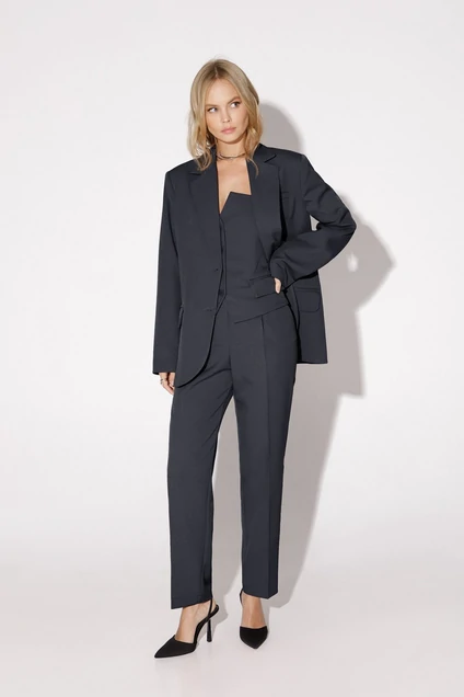 Брюки с высокой посадкой на притачном поясе со шлевками, передние половины с небольшими застроченными мягкими складками и заутюженными стрелками, застежка на молнию и пуговицу, боковые карманы.