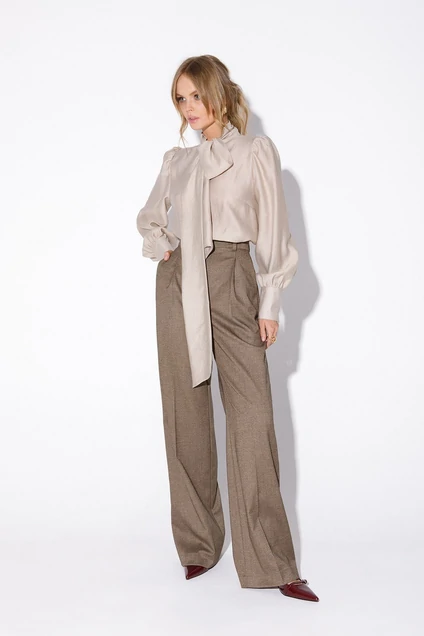 Детали: брюки с притачным поясом со шлевками, передние половины с небольшими застроченными мягкими складками и заутюженными стрелками, застежка на молнию и пуговицу, боковые карманы. Задние части с вытачками и заутюженными стрелками. Пояс брюк прямой, без резинки.