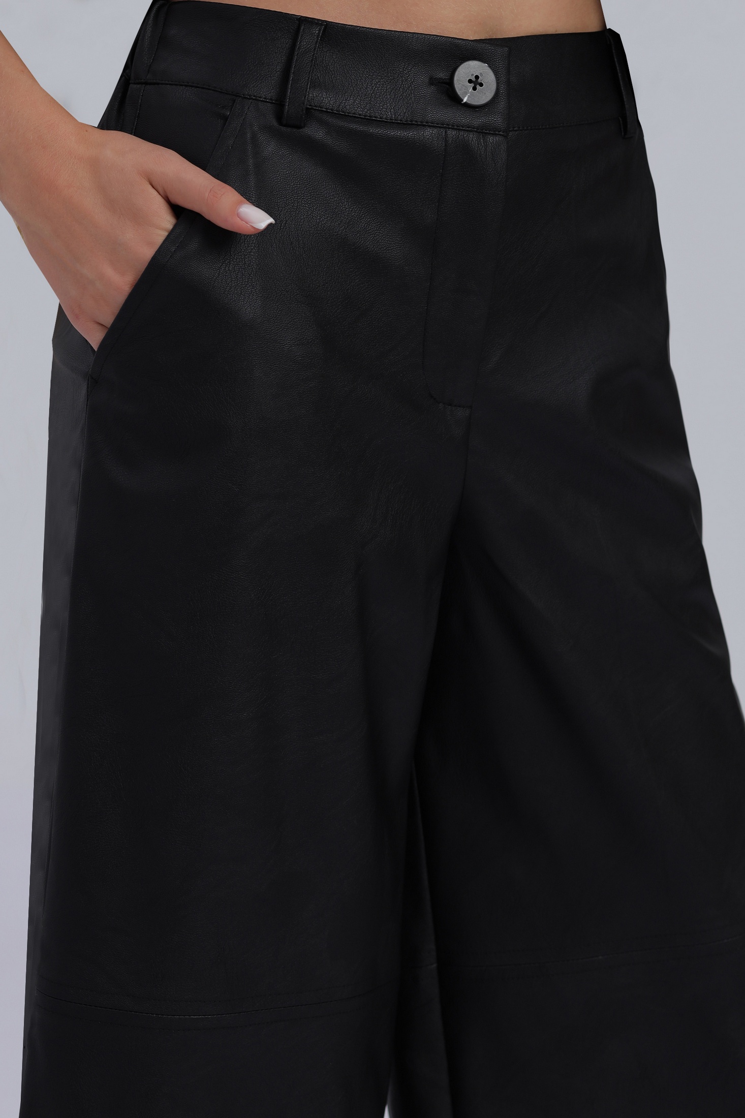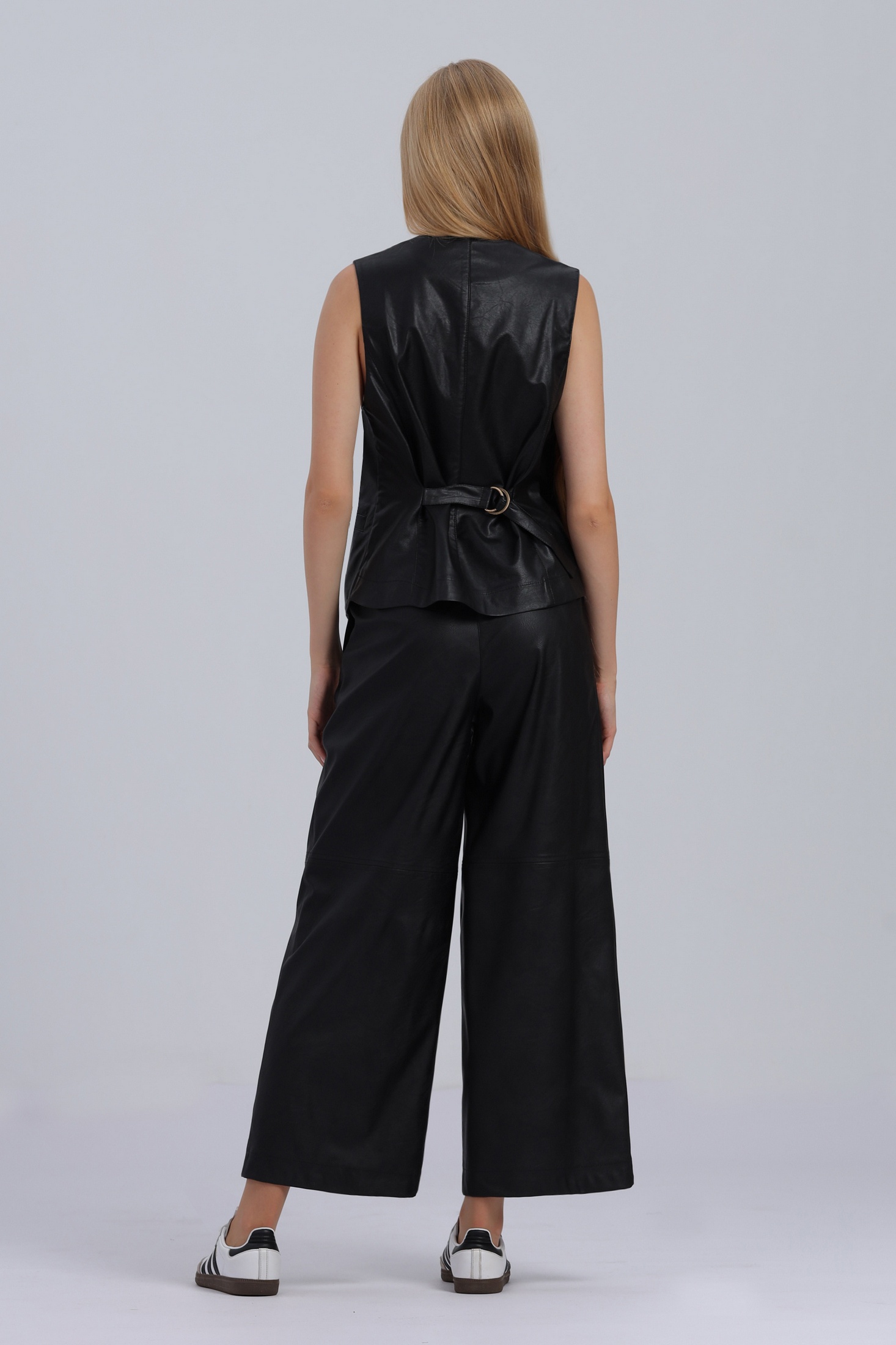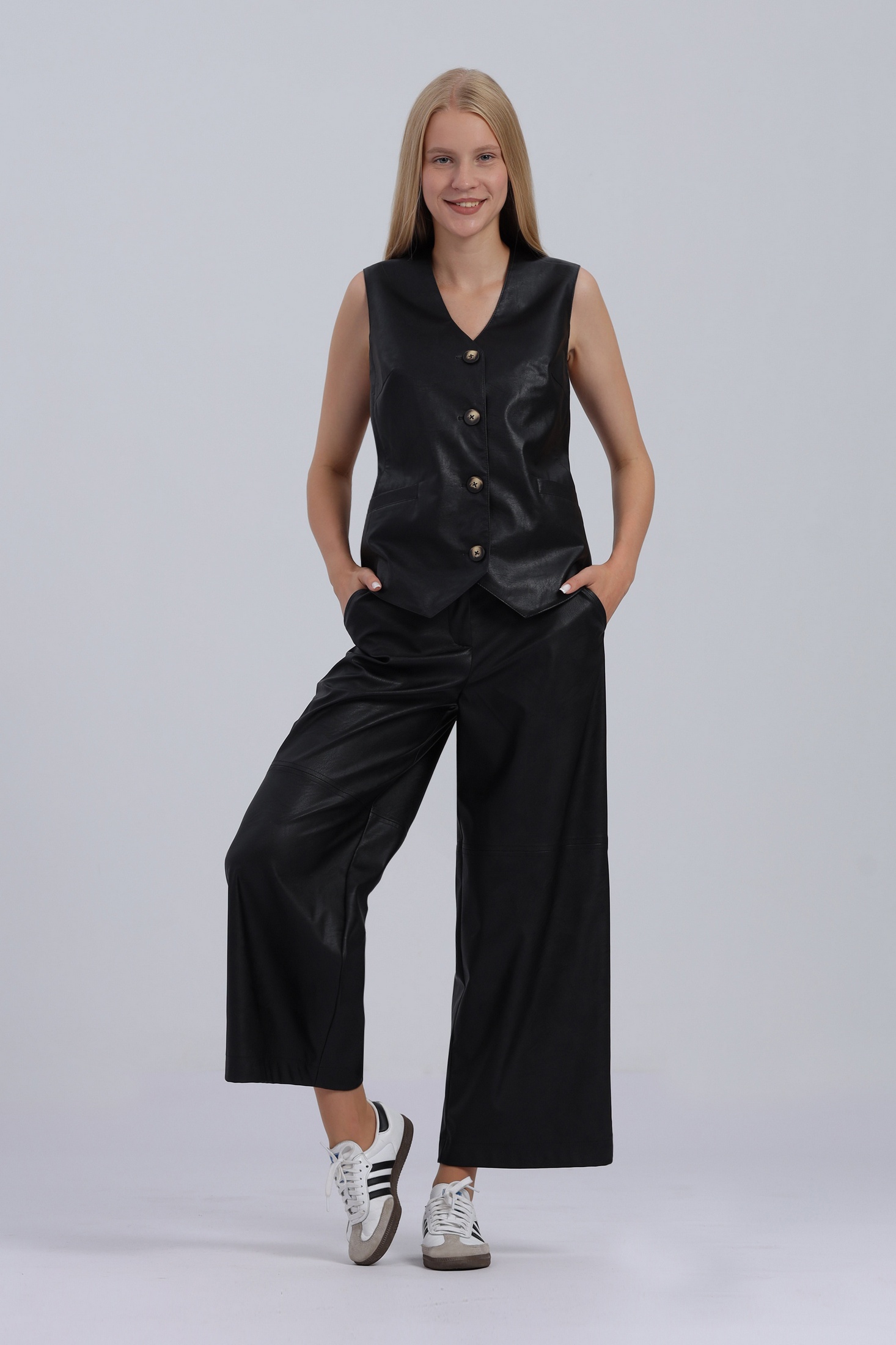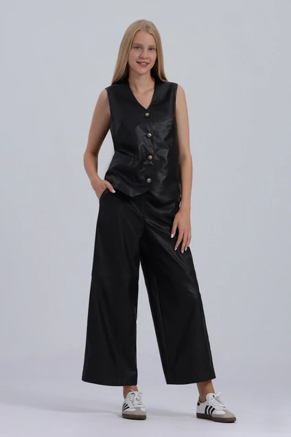 Женские брюки прямого силуэта из искусственной кожи с подрезом — стильное и универсальное решение для вашего гардероба. Материал обладает мягкой текстурой и эффектным матовым блеском, создающим элегантный внешний вид. Свободный крой подчеркивает комфорт при носке, а высокая посадка визуально удлиняет ноги и акцентирует талию. Штаны выполнены в классическом черном цвете, что делает их подходящими для различных образов — от повседневных до вечерних. Эластичная резинка сзади по линии талии обеспечивает удобную фиксацию и адаптацию к фигуре. По бокам расположены два функциональных кармана, которые добавляют практичности. Укороченная длина 7/8 создает модный акцент, позволяя подчеркнуть обувь. Широкие штанины придают изделию легкость и динамичность. Идеальный выбор для тех, кто ценит стильные решения с максимальным комфортом!