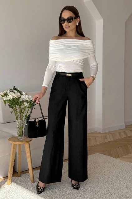 Промеры на примере 42 р.: Длина изделия по боковому шву с учетом пояса 112 см, ОТ - 68 см, ОБ - 94 см. Ширина(1/2) брюк по низу 31,5 см.
