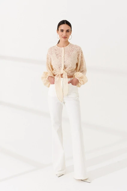 Брюки прямые свободной формы из хлопкового джинса. Задняя половинка брюк с кокеткой. Передние части со складками. Застежка спереди на молнию и пуговицу. В боковых швах карманы. На задних частях накладные карманы. По низу брюк оборка.
