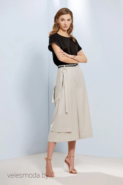 Юбка-кюлоты свободного кроя, длиной до середины икр. В боковых швах полноценные карманы, застежка спереди на молнию и пуговицу. Шлёвки - для тех, кто предпочитает ремни. Еще один декоративный элемент - массивное кольцо, в которое продевается лента, второй конец которой (при желании) фиксируется на спинке с помощью небольшого полукольца.