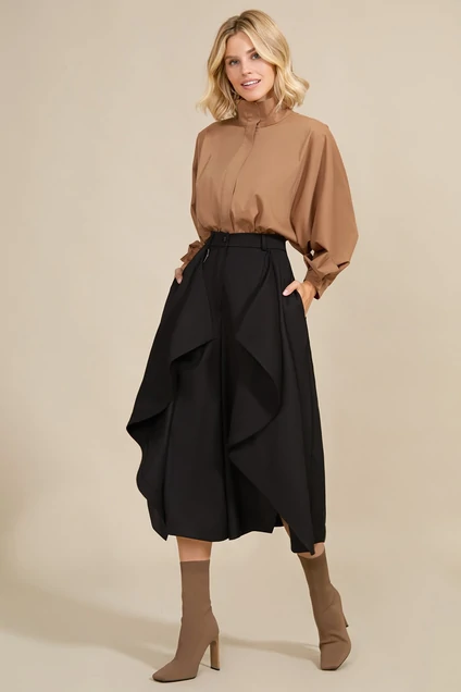 Кюлоты с высокой посадкой, выполнены из плотной, но максимально комфортной для ежедневной носки ткани. В боковых швах полноценные карманы, застежка спереди на молнию и пуговицу. По переду отлетные детали. В боковых щвах разрезы.