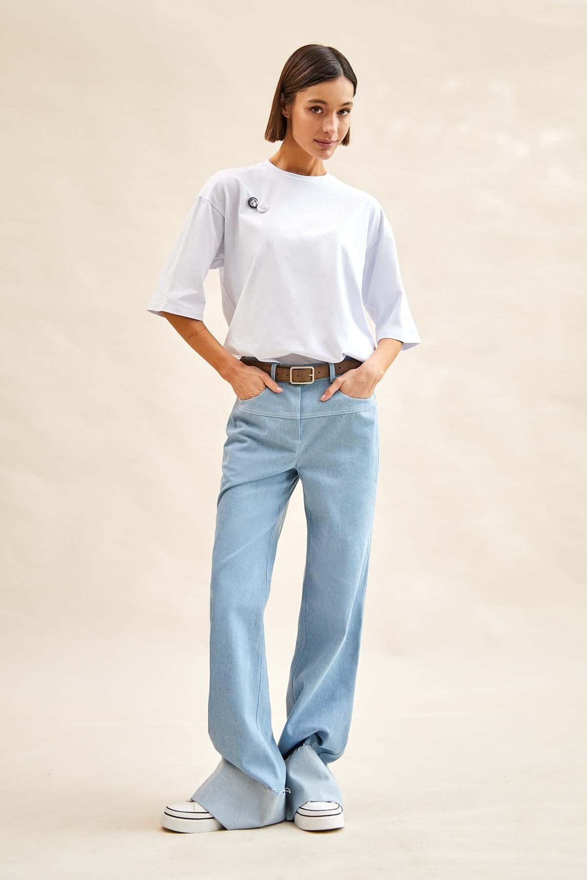 - застежка спереди на молнию и кнопку на притачном поясе;