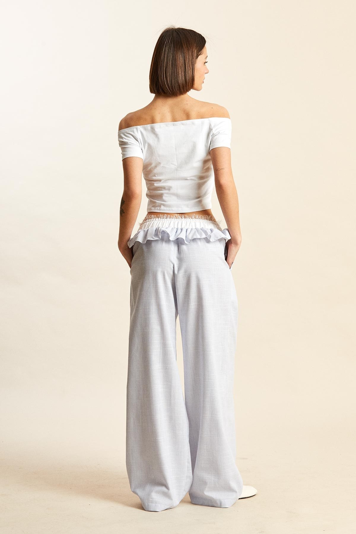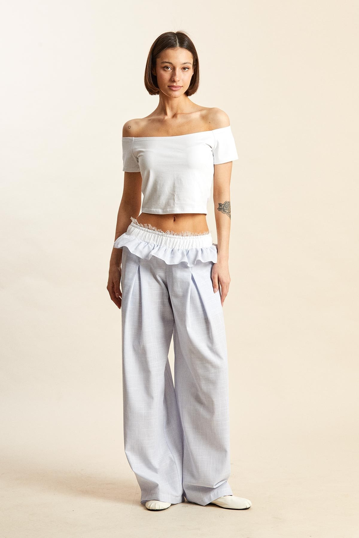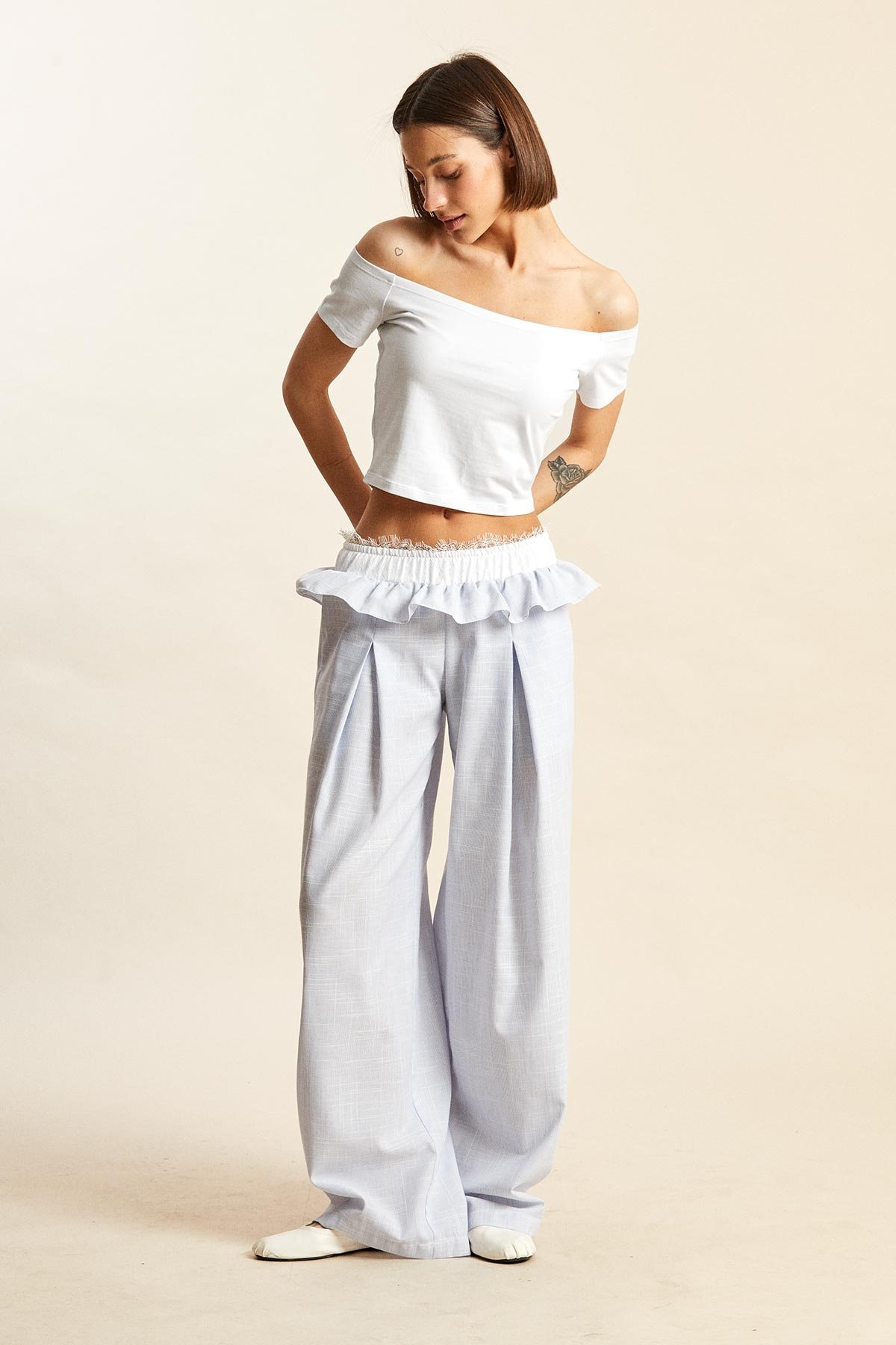 Брюки 5264 бело-голубой Rivoli привносят легкость и стиль в ваш гардероб. Коллекция бренда Rivoli предлагает свободный силуэт со встречными складками спереди и изысканным кружевным поясом на резинке. Эти брюки из 100% хлопка обеспечивают комфорт и легкость, делая их идеальными для теплого сезона. Практичные карманы в боковых швах добавляют функциональности, а воздушная оборка вдоль талии придает женственности. Бело-голубой оттенок подчеркивает свежесть и легкость, создавая образ для повседневных выходов или уютных домашних вечеров.