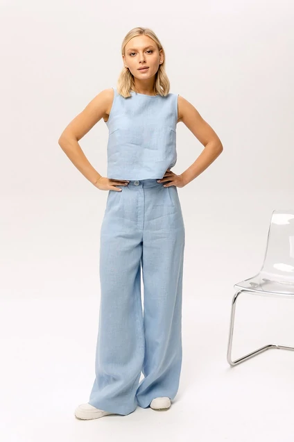 Брюки палаццо свободного кроя с вместительными боковыми карманами. Посадка-высокая. В пояс брюк по спинке вставлена эластичная тесьма. Модель с небольшим клёшем от бедра.Изготовлены брюки с ткани в составе которой 100% лен. Натуральный материалхорошо пропускае воздух.