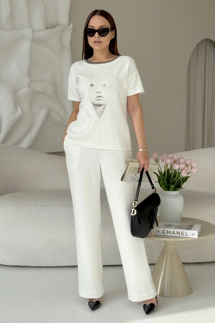 Брюки женские из трикотажной ткани. В боковых швах расположены карманы. В пояс вставлена резинка и втянут декоративный шнур с наконечниками. (молнии нет).
