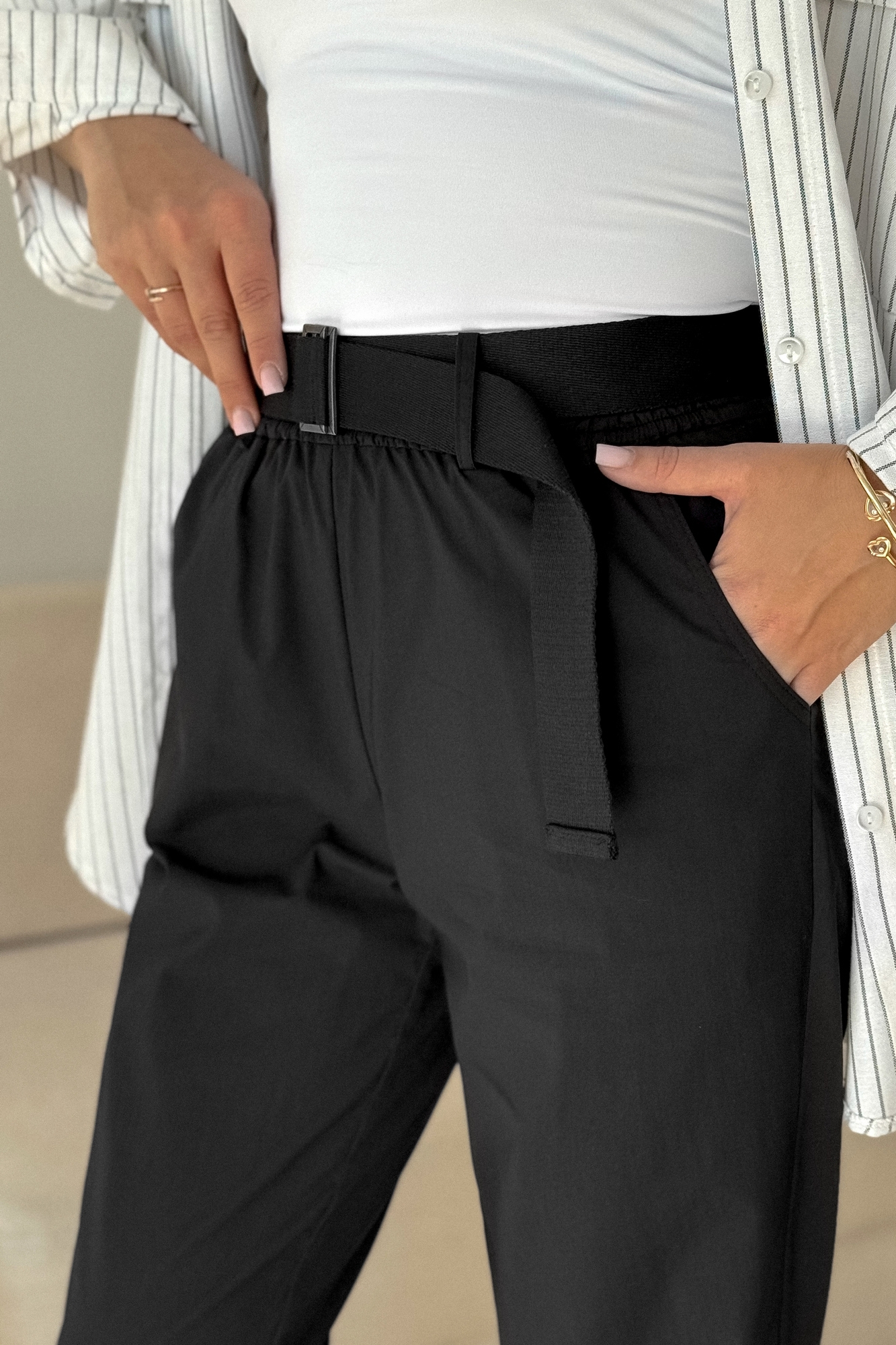 Брюки женские из текстильной ткани, слегка заужены к низу. В боковых швах расположены карманы. По низу передних половинок есть защип. Задняя половинка брюк с отрезной кокеткой и накладными карманами. Вверх брюк обработан поясом с резинкой (без молнии). ПОЯС ВХОДИТ В КОМПЛЕКТ.