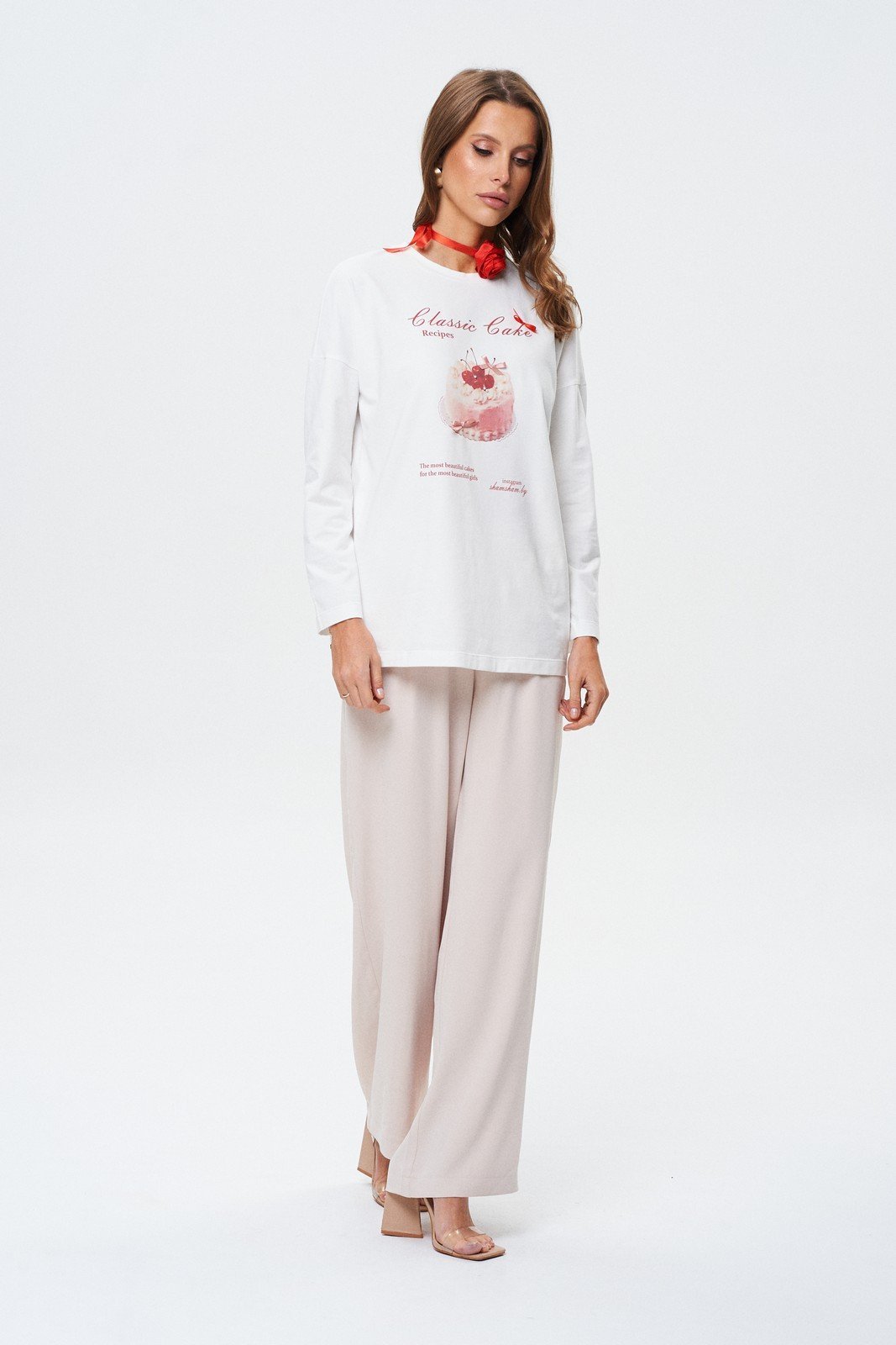 Элегантные струящиеся брюки свободного, прямого силуэта, средней посадки в пудровом оттенке. На переде изделия расположены защипы. Брюки очень комфортные, расслабленные, легко комбинируются с различными верхами и будут долго оставаться актуальными.