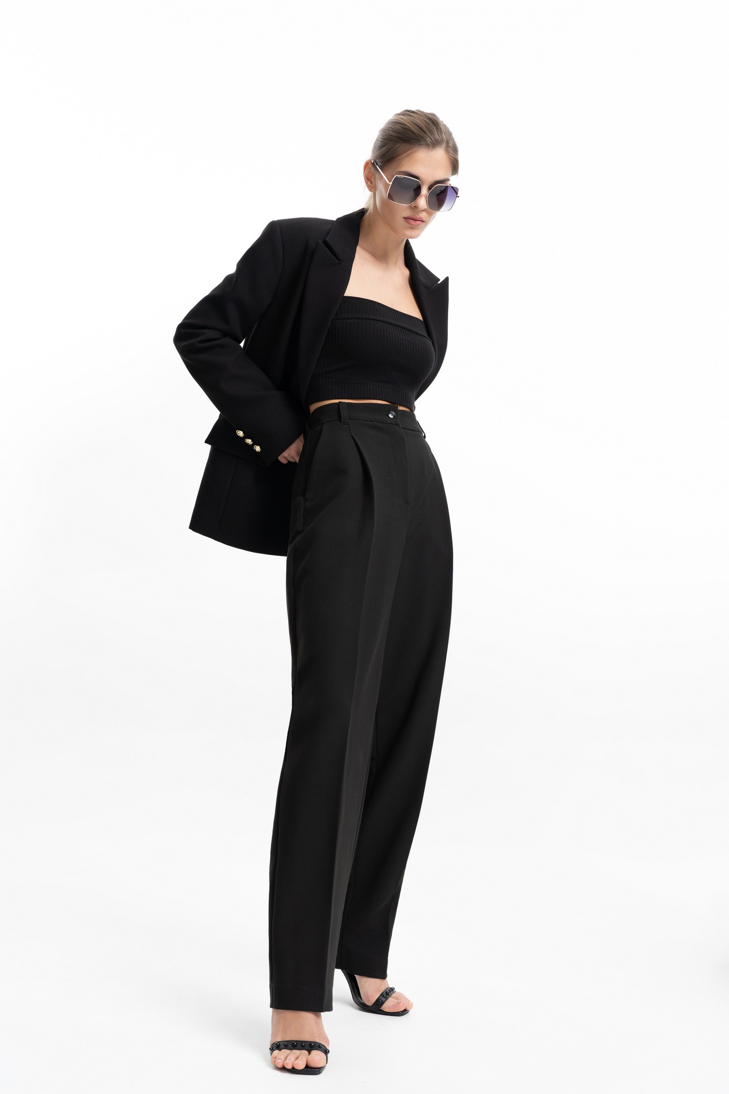 Брюки актуального силуэта, свободные, слегка заужны к низу. На передних половинках заутюжены стрелки, переходящие в складки по линии талии. Застежка-гульфик, по переду боковые наклонные карманы. Пояс стабильный по переду, по задней части брюк на резинке, с настроченными шлевками и застежкой на пуговичку. Длина брюк по боковому шву с поясом 107 см.