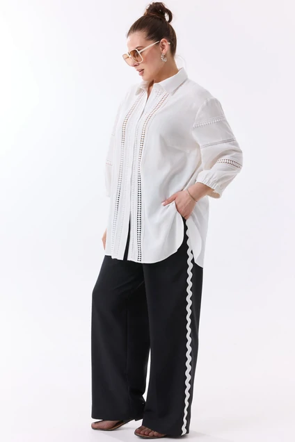Брюки палаццо выполнены из льна -вишер. Пояс на резинке, дополнительно в пояс вставлен шнур для регулировки посадки на талии в боковых швах карманы.