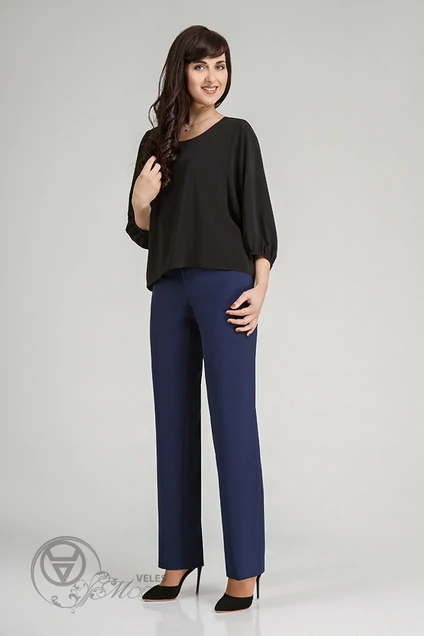 Брюки женские, с притачным поясом шириной 4 см, застегивающимся на петлю и пуговицу, четыре шлевки на поясе, по бокам пояса вставлена резинка. По передним и задним частям брюк талиевые вытачки. На задних частях брюк имитация кармана с втачной листачкой. Застежка на молнию. Длина брюк без учёта пояса 105 см (±1-2 см).