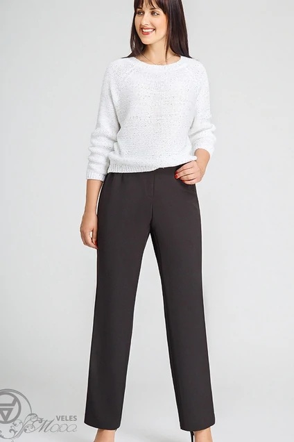 Брюки женские, с притачным поясом шириной 4 см, застегивающимся на петлю и пуговицу, четыре шлевки на поясе, по бокам пояса вставлена резинка. По передним и задним частям брюк талиевые вытачки. На задних частях брюк имитация кармана с втачной листачкой. Застежка на молнию. Длина брюк без учёта пояса 105 см (±1-2 см).