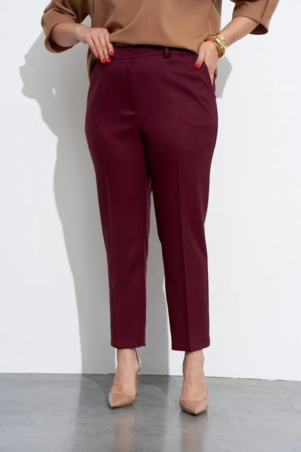Брюки классические, слегка зауженные к низу, с заутюженными стрелками спереди и сзади. На передних половинах обработаны карманы с косым входом, застёжка на молнию и пуговицу. Верх брюк на притачном поясе со шлёвками и эластичной тесьмой .