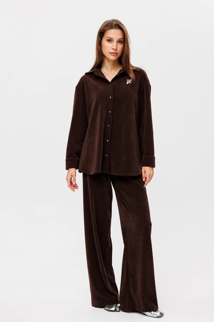 Брюки свободного кроя из мягкой вельветовой трикотажной ткани. Данную модель можно сочетать с рубашкой,топом арт 2298, дополнив образ различными аксессуарами, обувью на плоской подошве, обувью на шпильке ,также подойдут кеды или кроссовки для более повседневных образов в сочетании с футболкой. Талия высокая, брюки на резинке , длина по боковому шву 110 см.
