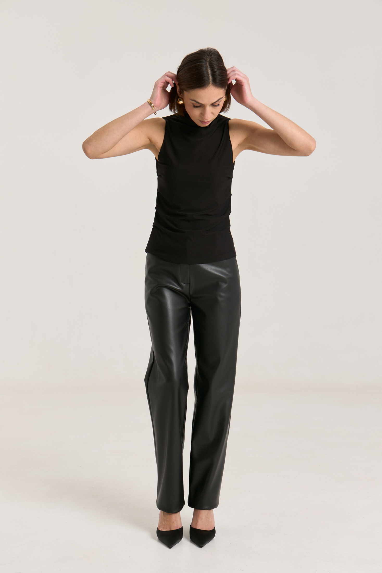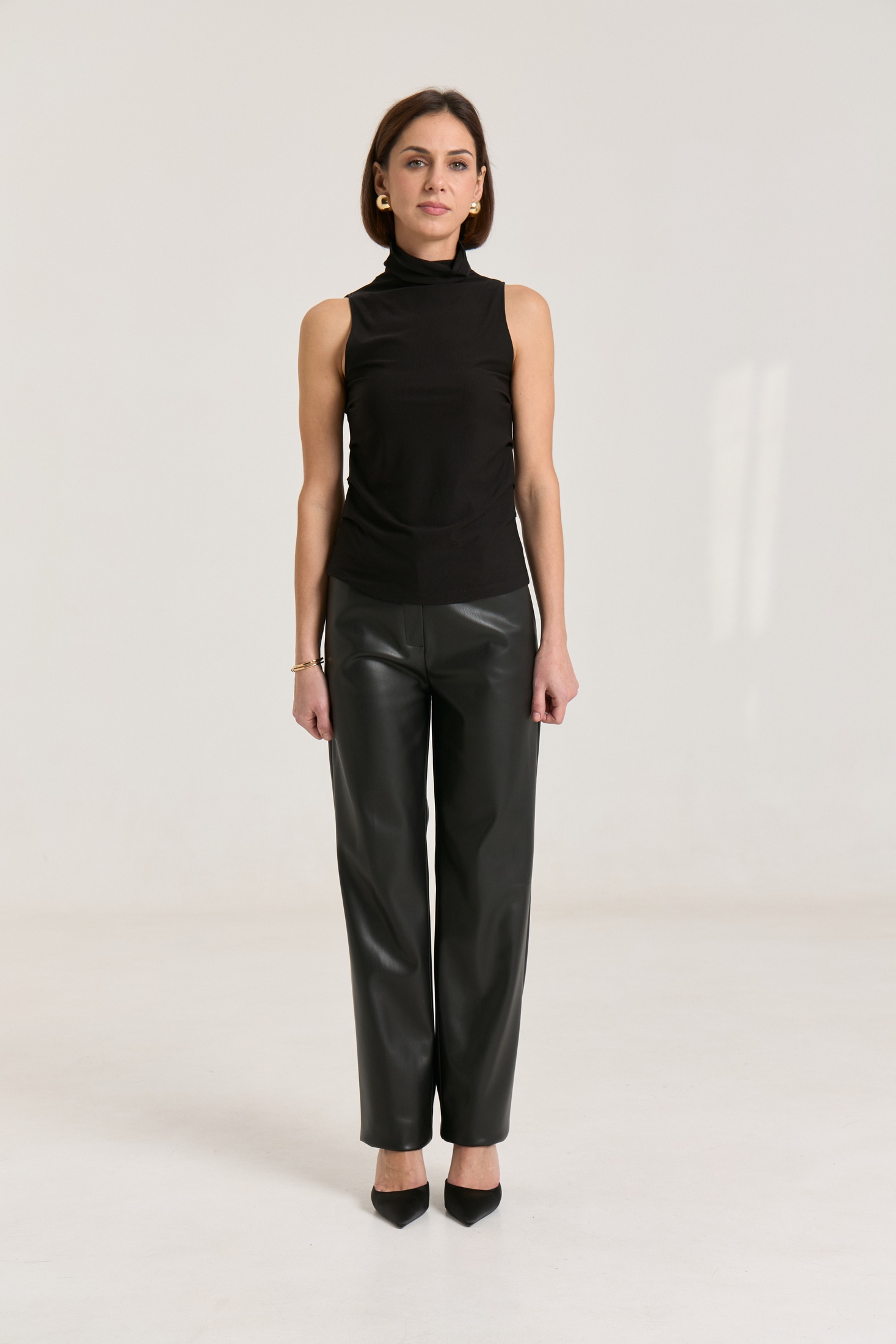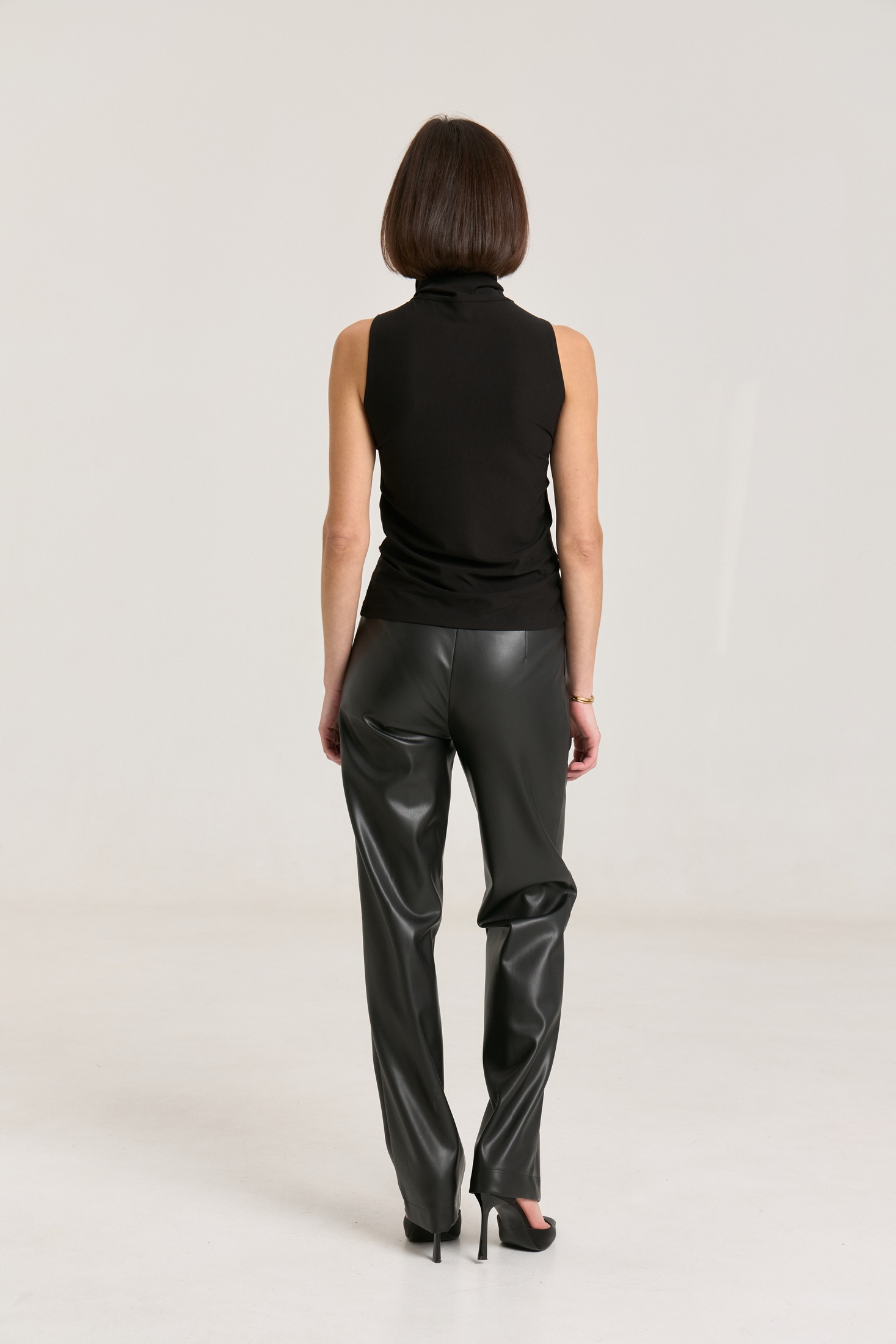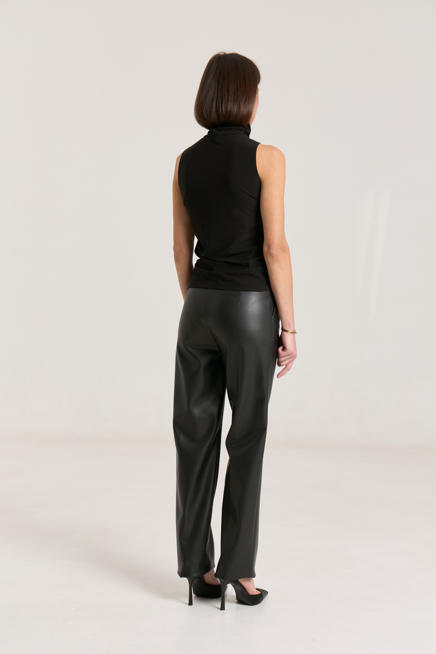Брюки прямые, пояс притачной со шлевками, застежка на петлю-пуговицу, по переду гульфик с застежкой на молнию, сзади имитация карманов на задних половинках брюк, спереди боковые функциональные карманы, посадка высокая.Классический крой отлично гармонирует с мягкими свитерами и полупрозрачными блузками, выполнены из мягкой экокожи на "замшевой" основе
