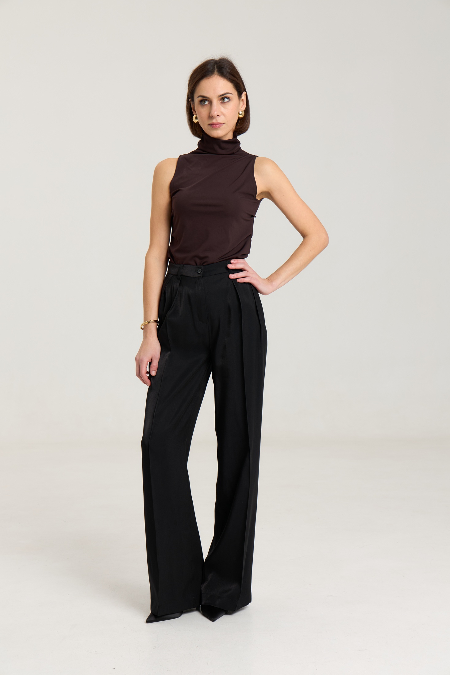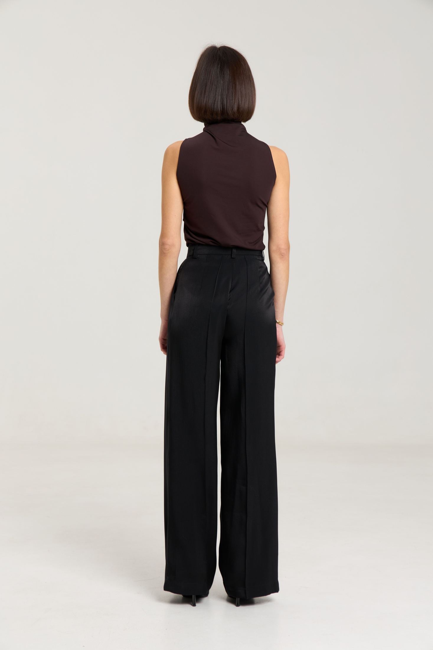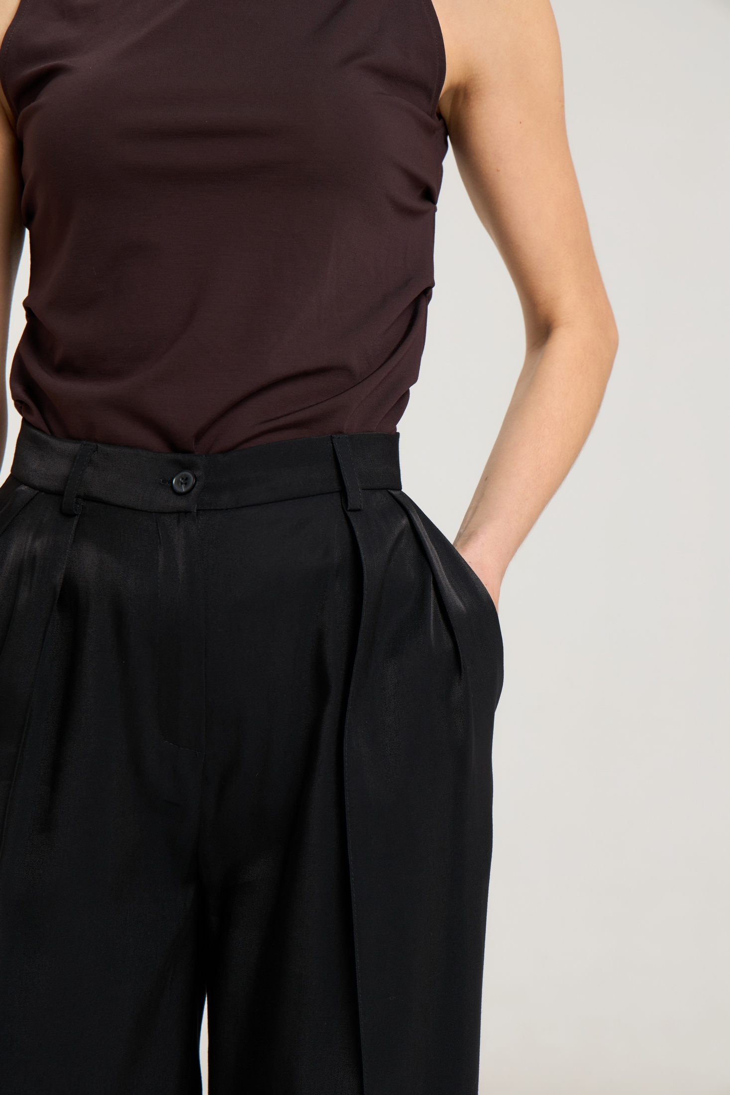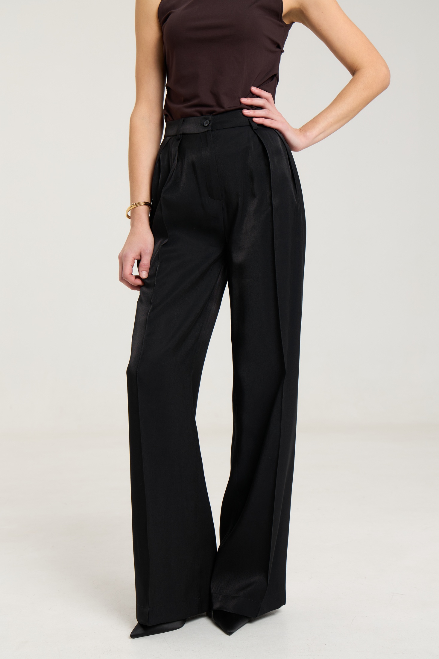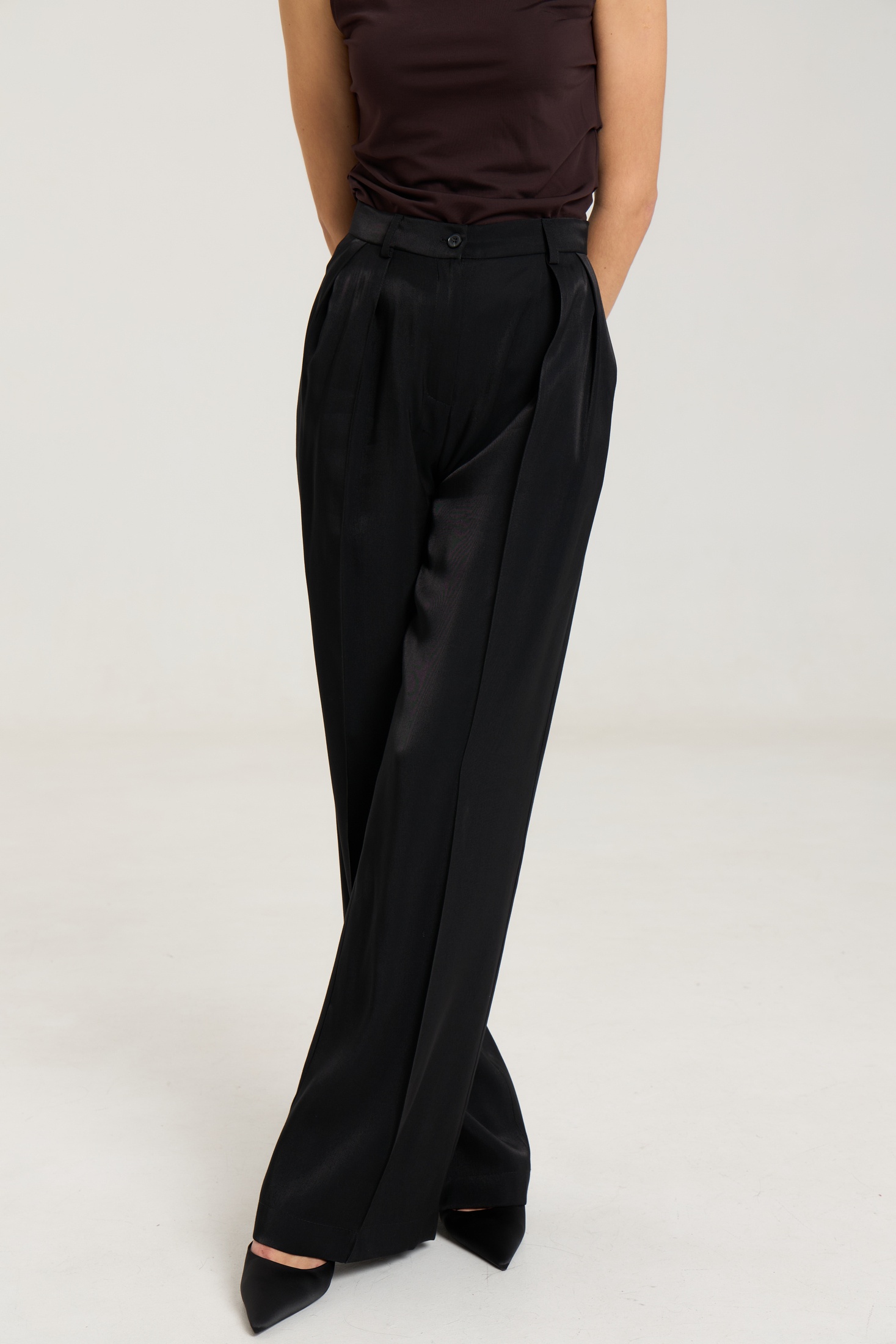 Брюки на притачном поясе со шлевками, спереди застежка на молнию и петлю-пуговицу, по переду защипы, посадка высокая. По передним половинкам брюк функциональные карманы и две двусторонние складки, выполнены из премиальной ткани с блеском, ткань легкая. по переду и сзади отсточены стрелки.