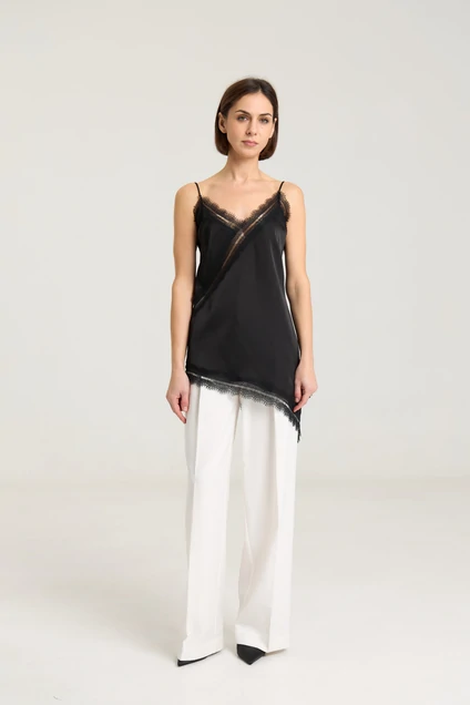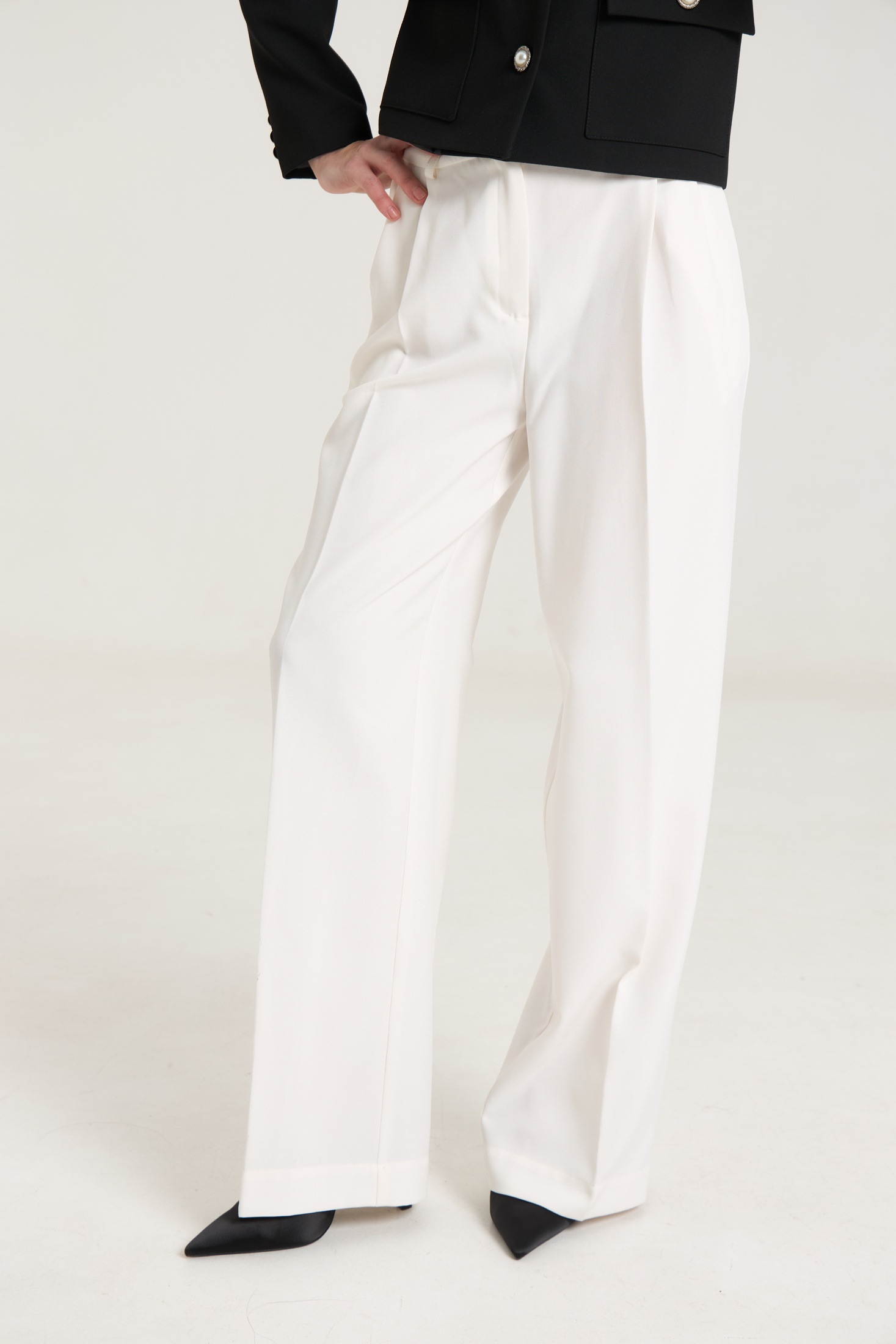 Брюки прямые классические с боковыми карманами, спереди застежка- молния, по переду защипы. Брюки выполнены из премиальной ткани костюмной группы.Верх брюк обработан притачным поясом со шлевками. Выполнены из плотной костюмной ткани молочного цвета.Брюки не просвечивают.