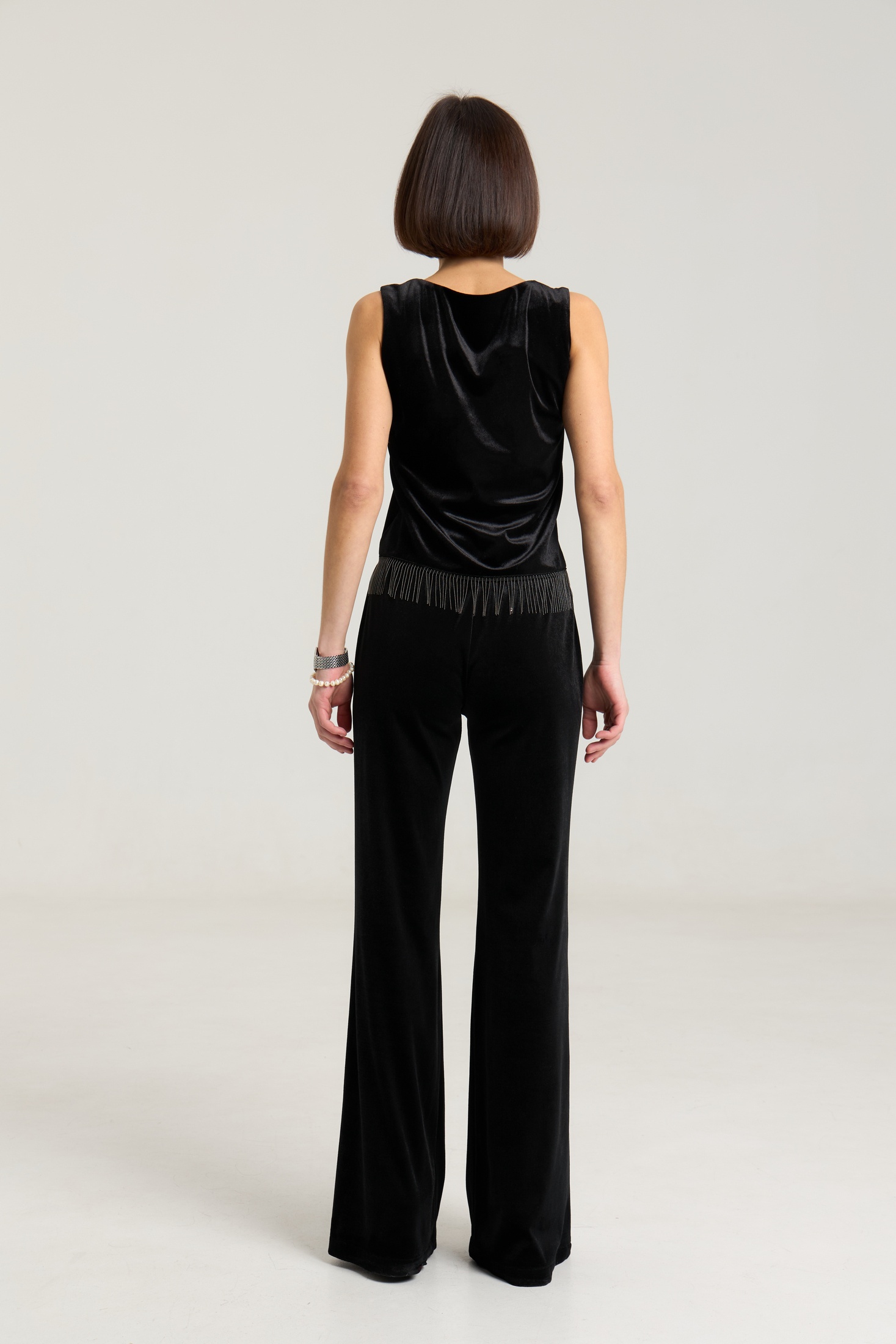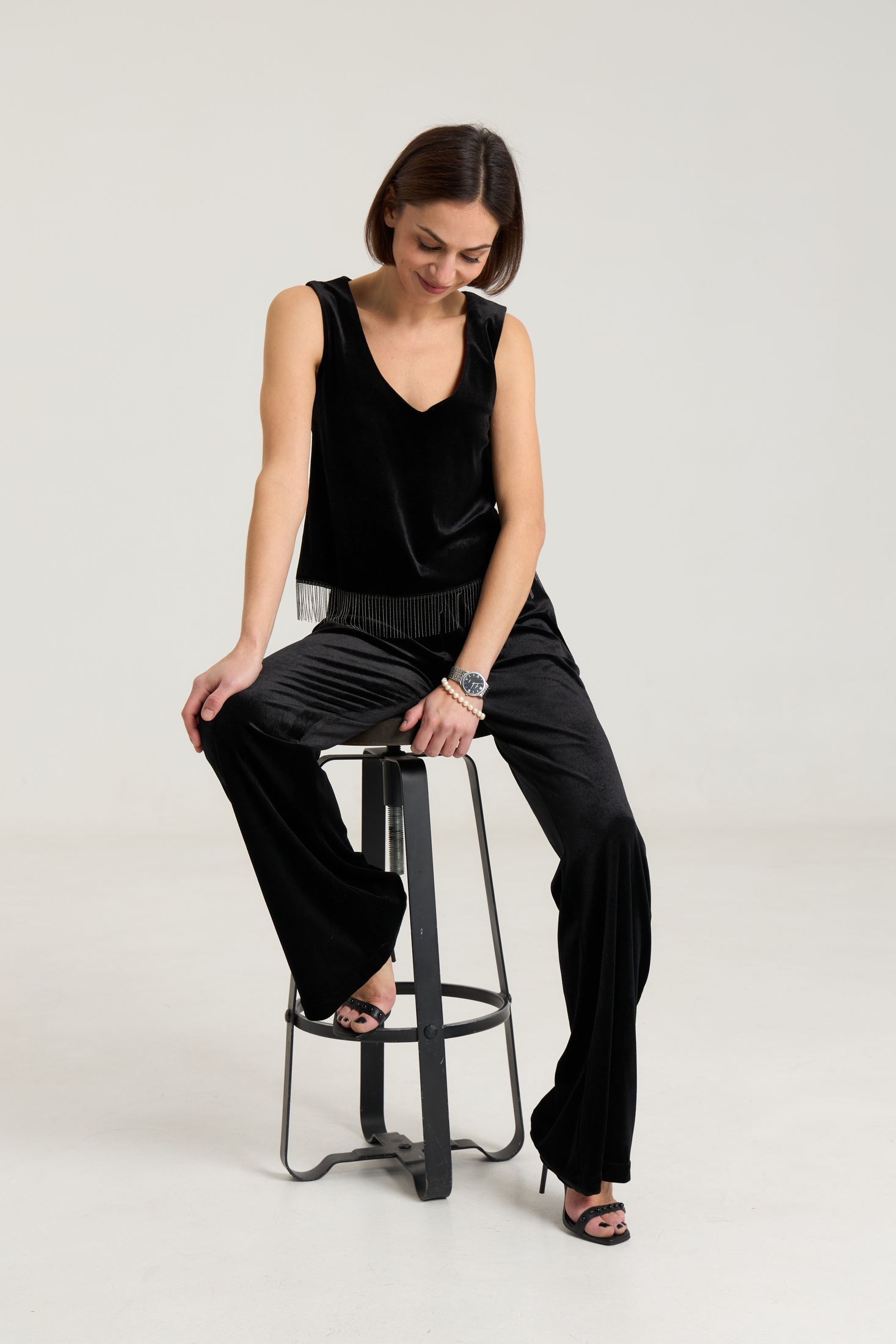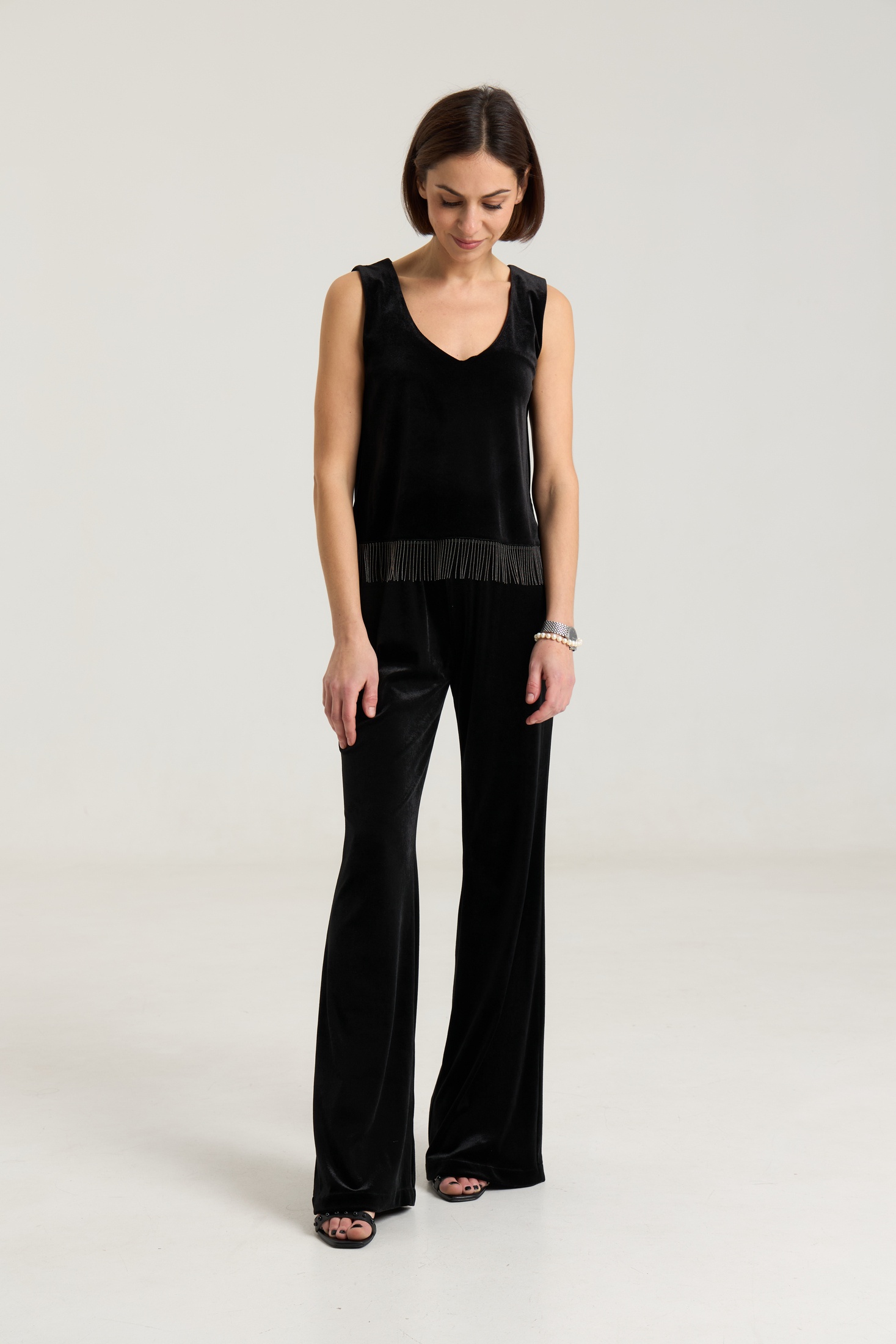 Брюки расклешенные свободного кроя из велюровой ткани - это не только модель для праздника. Данную модель можно сочетать с рубашкой, блузкой, жакетом из бархата арт. 2474 , топом арт. 2468 дополнить образ различными аксессуарами, обувью на плоской подошве, обувью на шпильке ,также подойдут кеды или кроссовки для более повседневных образов в сочетании с футболкой и кожаной курткой. Талия высокая, брюки на резинке ,