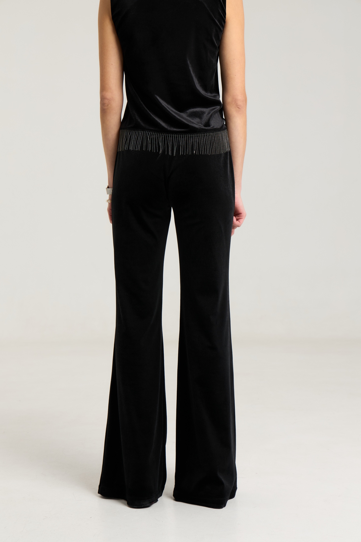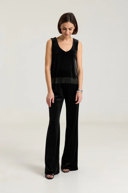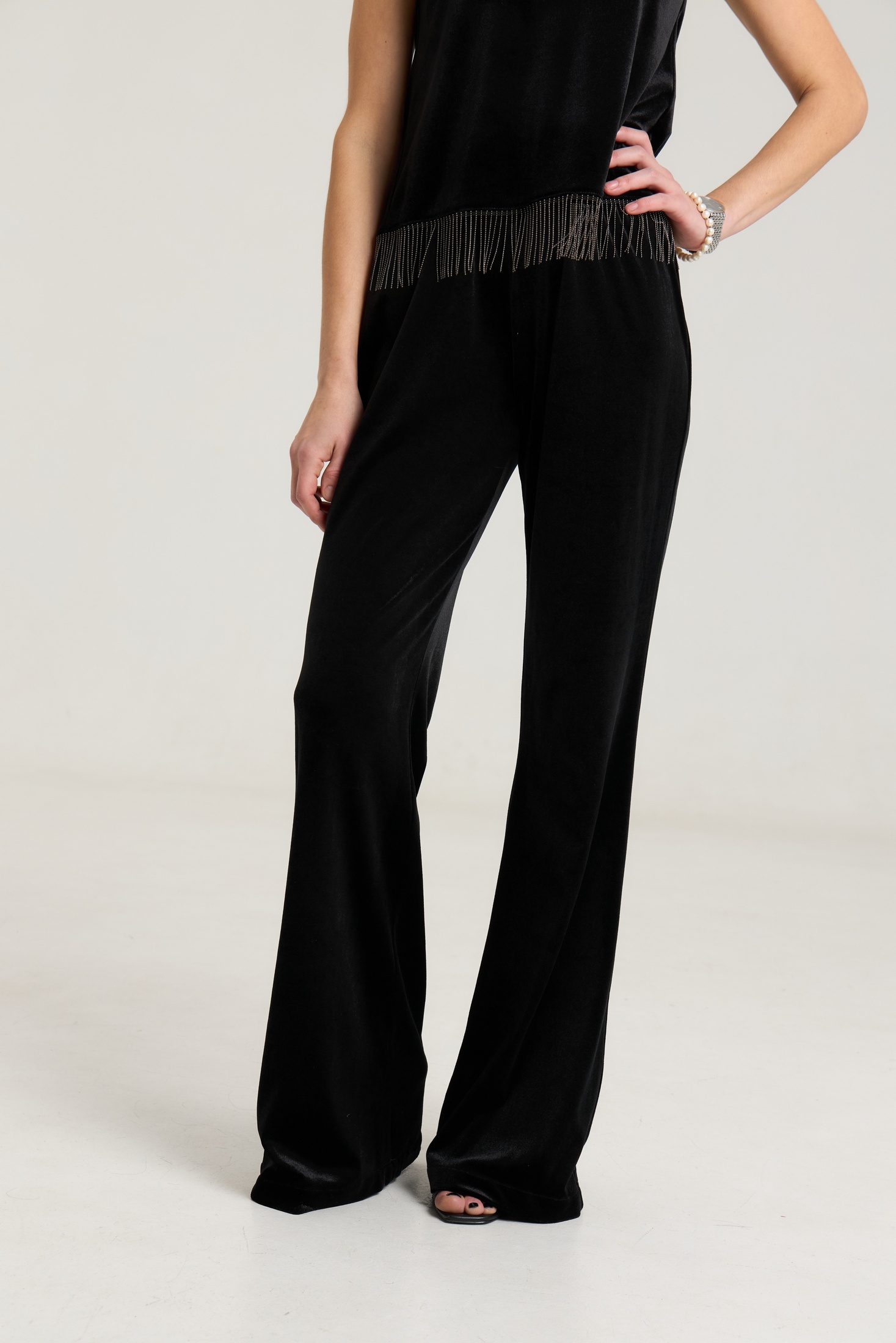 Брюки расклешенные свободного кроя из велюровой ткани - это не только модель для праздника. Данную модель можно сочетать с рубашкой, блузкой, жакетом из бархата арт. 2474 , топом арт. 2468 дополнить образ различными аксессуарами, обувью на плоской подошве, обувью на шпильке ,также подойдут кеды или кроссовки для более повседневных образов в сочетании с футболкой и кожаной курткой. Талия высокая, брюки на резинке ,