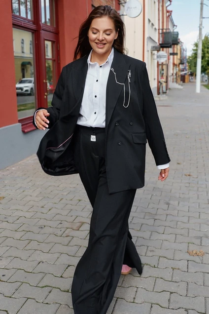 Брюки женские прямого силуэта, с небольшим защипом по талии. Акцентные вертикальные швы перенесенные на перед по боку, вытягивают силуэт. Сзади карман с листочкой, боковые карманы вертикальные. Сзади по поясу эластичная тесьма. Акцент брендированная лейба по застежке.