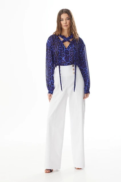 Брюки прямые из джинсовой ткани. Верх на высокой кокетке. Застежка сзади на декоративную молнию. На кокетке передних частей брюк декоративные пуговицы.