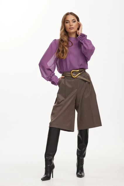 Бриджи удлиненные из костюмной ткани. Верх на поясе со шлевками. По переду складки. Застежка по переду на молнию и пуговицу. В боковых швах карманы.
