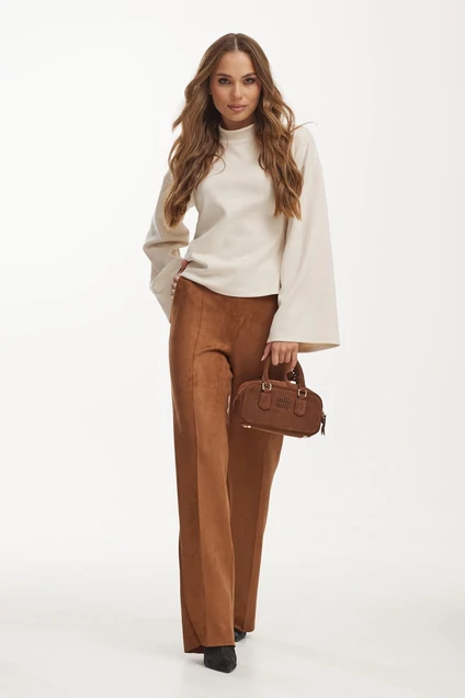 Брюки прямые из трикотажного полотна с ворсовым покрытием. Верх на узком поясе. Застежка в боковом шве на потайную молнию. В боковых швах карманы.
