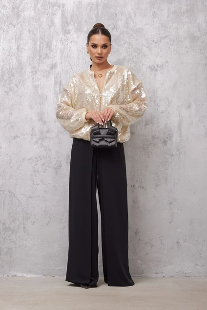 Брюки расширенные книзу. Верх на притачном поясе. Застежка в боковом шве на потайную молнию. По передним частям брюк отлетные детали.