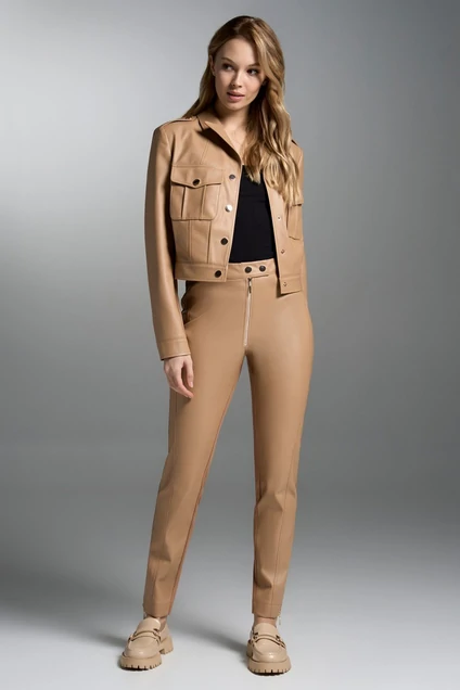 Брюки зауженные к низу из эко кожи с х/б изнанкой и трикотажного полотна.Застёжка центральная на молнию и кнопки.На передних половинках брюк выполнены фигурные рельефы с отделочными строчками.В боковые швы по низу вставлены молнии.