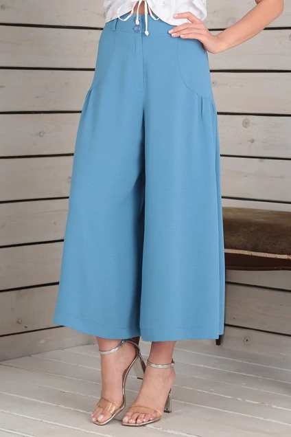 Кюлоты из легкой струящейся ткани с эффектом «креш» на притачном поясе. По бокам подрез со сборкой. На поясе обработаны шлевки для продевания пояса. Застежка по поясу на пуговицы и молнию. Длина изделия - 92 см.