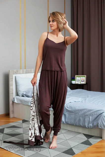 Комплект женский 3х предметный. Комплект состоит из брюк-шаровар, топа и блузона. Шаровары с высокой посадкой с притачной кокеткой- и резинкой по верху кокетки. В боковых швах имеются функциональные карманы. По низу брюк расположены широкие манжеты. Длина брюк по боковому 104см. топ полуприлегающего силуэта на тонких шлейках. Блузон свободного силуэта с цельнокроеным рукавом, по низу рукава широкая манжета. Горловина и борт окантованы отделочной тканью. По низу блузона находится широкая завязка из отделочной ткани.