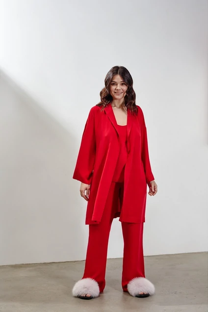 Халат-кимоно с глубоким запахом под пояс и карманами в боковых швах. Спущенная линия плеча, длина рукава ¾. Шалевый воротник.