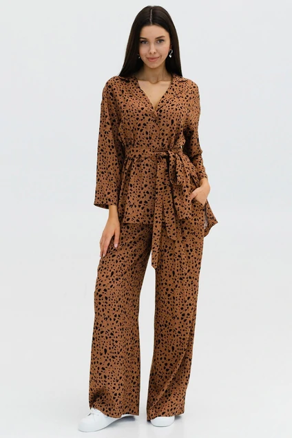 Этот костюм-пижама идеально подходит как для комфортного отдыха дома, так и для активного движения в городской суете. Он выполнен из мягкой и приятной на ощупь ткани, которая обеспечивает комфорт и уют. Блузка имеет прямой крой и немного удлиненную спинку, что создает дополнительный комфорт и элегантность. Она застегивается на пуговицы и имеет отложной воротничок с лацканами, что придает ей изысканный и стильный вид. Боковые разрезы на блузке добавляют легкости и воздушности образу. Брюки свободного кроя и широкие, что обеспечивает полную свободу движений. Пояс полностью эластичный и регулируется по размеру, что позволяет идеально подогнать костюм под фигуру. Карманы с отрезным бочком добавляют функциональности и удобства. В комплекте с костюмом идет пояс, который можно использовать для дополнительной фиксации блузки. Этот костюм-пижама станет незаменимым элементом вашего гардероба и подарит вам комфорт и уют на протяжении всего дня.