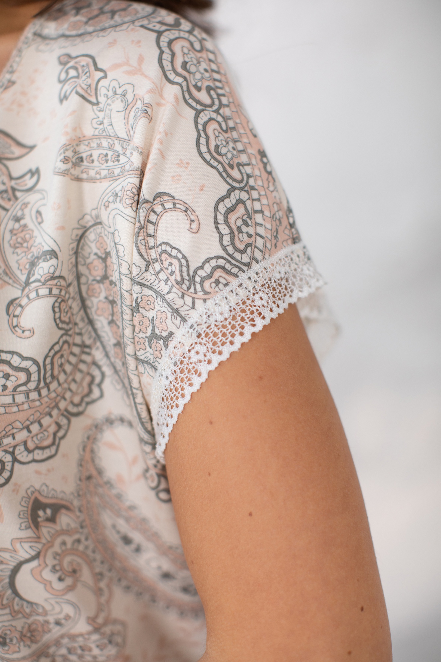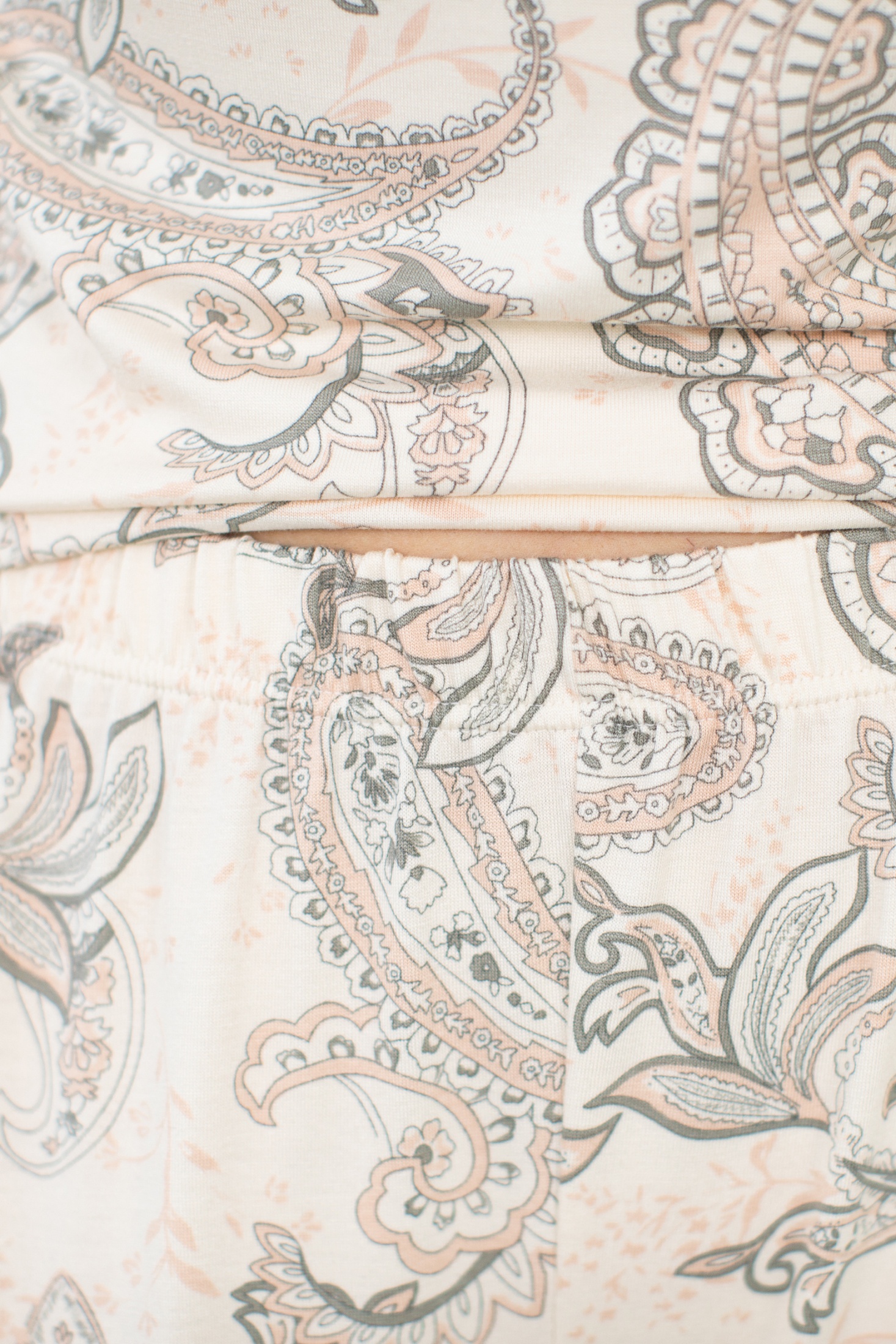 Изысканная женская пижама в элегантном светло-сером оттенке, украшенная изысканным пейсли принтом. Комплект включает в себя удобную футболку с короткими рукавами и круглым вырезом, а также прямые брюки на резинке для максимального комфорта. Мягкий и приятный к телу материал обеспечивает идеальный баланс между комфортом и стилем, делая эту пижаму идеальным выбором для домашнего отдыха. Принт пейсли добавляет богатую визуальную текстуру, делая образ выразительным и запоминающимся.