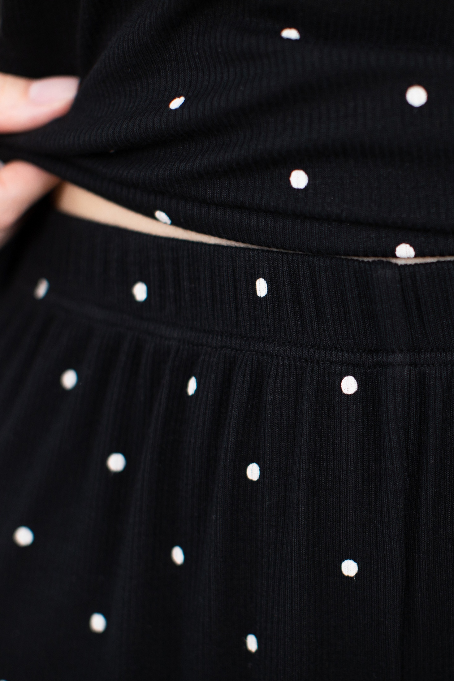 Изящная женская пижама, выполненная из легкого и приятного на ощупь материала. Комплект включает в себя топ на тонких регулируемых бретелях и короткие шорты. Основной цвет изделий – классический черный, украшенный стильным принтом в виде мелких белых точек. Горловина топа элегантно дополнена кружевной отделкой белого цвета, добавляющей образу нежность и женственность. Этот комплект идеален для домашнего отдыха, сочетая в себе комфорт и современный дизайн.