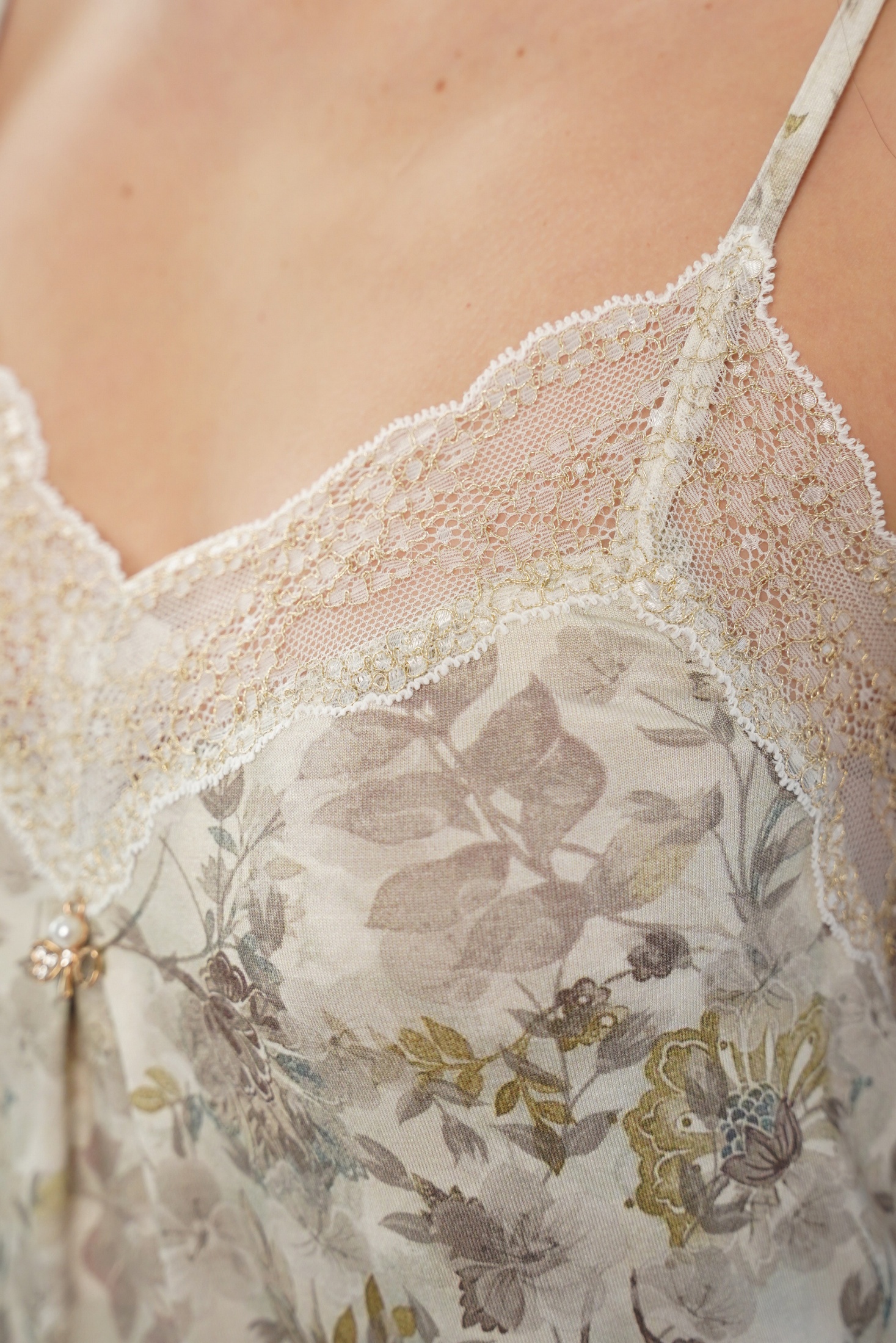 Изящная ночная сорочка с романтическим уклоном. Основной тон - светлый с нежным цветочным принтом в пастельных оттенках зеленого, бежевого и серого. Модель с тонкими регулируемыми бретельками обеспечивает идеальную посадку. Лиф сорочки декорирован изящным кружевом, добавляющим изысканности и женственности образу. Данная сорочка идеально подходит для создания комфорта в ночное время, не уступая в элегантности и стиле.