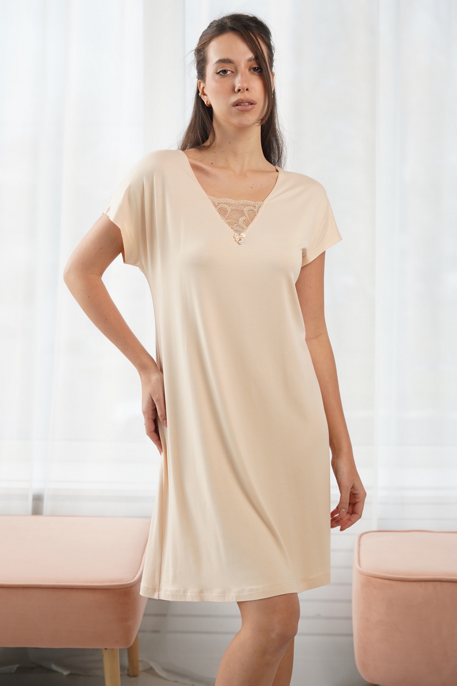 Элегантная ночная сорочка пастельного бежевого цвета обязательно привлечёт внимание своей изысканностью и комфортом. Изготовлена из приятного на ощупь материала, этот элемент женской гардероба обеспечивает идеальную посадку и комфорт на протяжении всей ночи. Сорочка дополнена V-образным вырезом, украшенным тонкой кружевной вставкой, что добавляет изделию женственности и нежности. Короткие рукава идеально подходят для тёплых ночей. Длина изделия до колена подходит для обеспечения комфорта без ограничений движений.