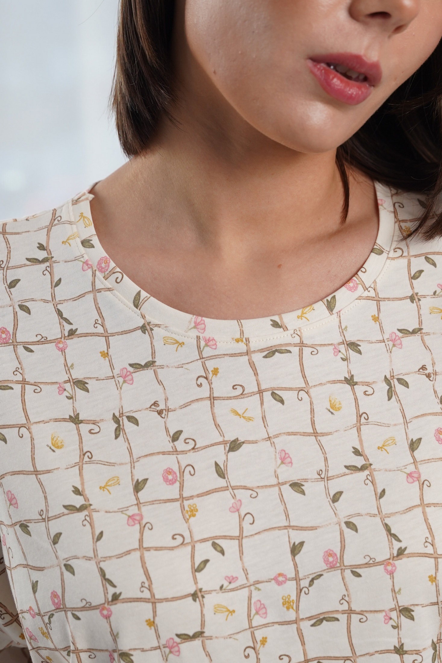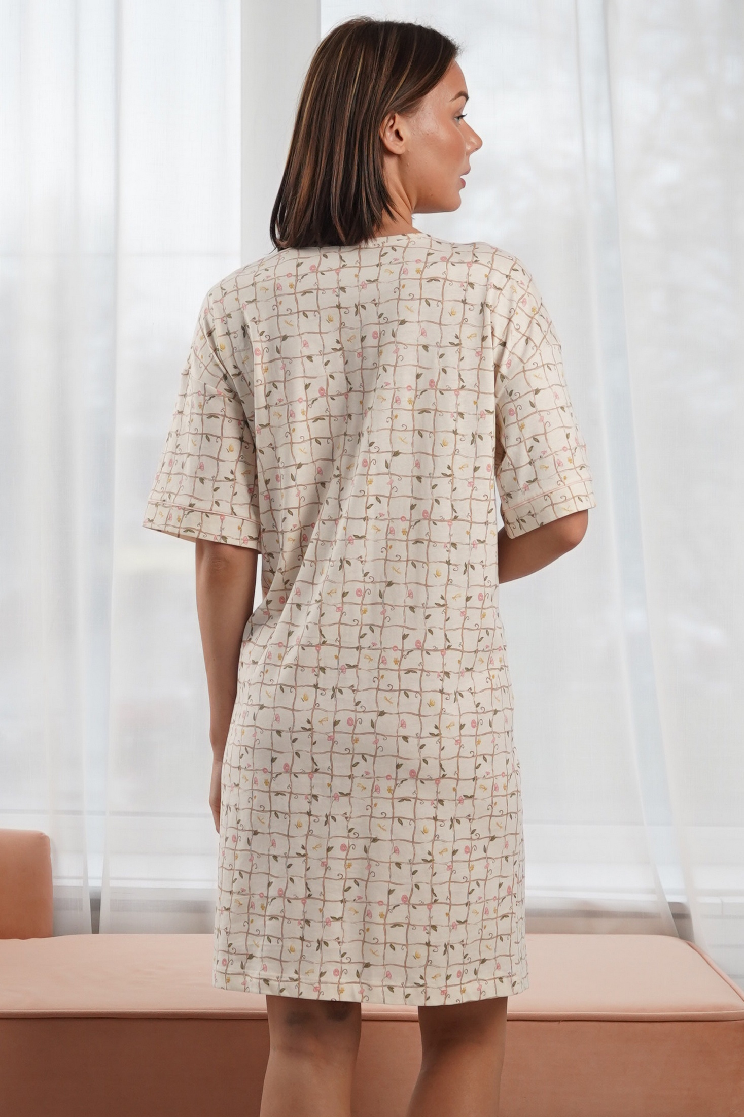 Элегантная ночная сорочка пастельных оттенков с деликатным геометрическим принтом в стиле ретро. Модель выполнена из мягкого и приятного к телу материала, обеспечивающего комфорт во время сна. Сорочка имеет свободный крой с короткими рукавами и длиной до середины бедра, что добавляет изделию удобства. Круглый вырез горловины дополнительно подчеркивает женственность и изящество фасона. Это идеальный выбор для тех, кто ценит комфорт и стиль в домашнем гардеробе.