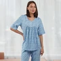 Изящная женская пижама, идеальный выбор для уютного домашнего отдыха. Комплект включает в себя футболку с короткими рукавами и брюки, выполненные в мягких серых тонах с изящным цветочным принтом. Футболка имеет свободный крой с удобным V-образным вырезом, что добавляет изделию легкости. Брюки прямого кроя обеспечивают максимальный комфорт благодаря эластичному поясу. Этот комплект пижамы подходит как для ночного отдыха, так и для расслабленного времяпрепровождения дома.