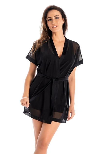 Короткий полупрозрачный пеньюар на запах с поясом и спущенной линией плеча, выполненный из мягкого эластичного сетчатого полотна, позволит вам всегда выглядеть женственно и сексуально.
