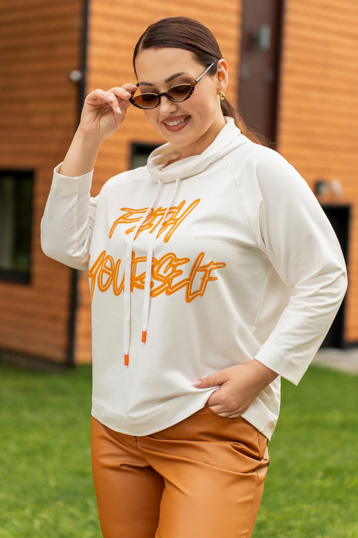 Джемпер женский прямого кроя, воротник-стойка со шнуром, с цветной печатью на полочке. Рукава втачные с притачными манжетами. Спинка цельная.низ с притачным поясом.