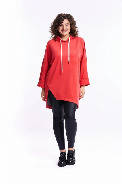 Толстовка-худи выполнена из двухстороннего трикотажного полотна. По переду платья с одной стороны выполнен разрез наклонный, выходящий из бокового шва. Перед толстовки короче спинки. Спинка со средним швом. Низ изделия на обтачке. Линия плеча спущена. Рукав широкий и втачной, внизу на цельнокроенной манжете. Капюшон однослойный с блочками и отдлечным шнуром, протянутым в них. Толстовка очень стильная, удобная, необычная подойдет для прогулок, занятия спортом. Длина изделия по спинке 88,5 см, длина рукава 64см. 50 размер: 126см, ОТ 124см, ОБ 124см, 52 размер: 130см, ОТ 128см, ОБ 128см, 54 размер: ОГ 134см, ОТ 132см, ОБ 132см.